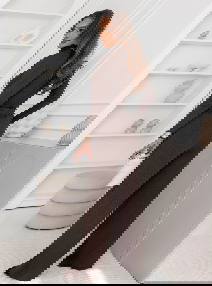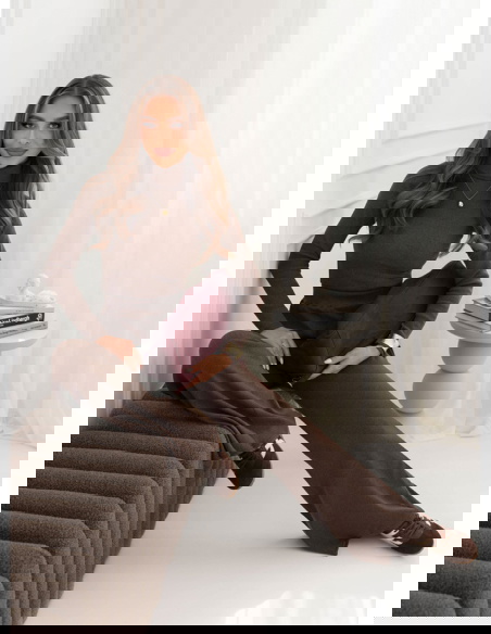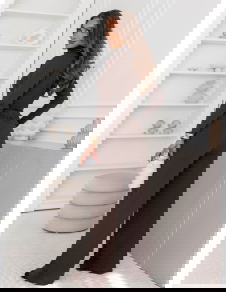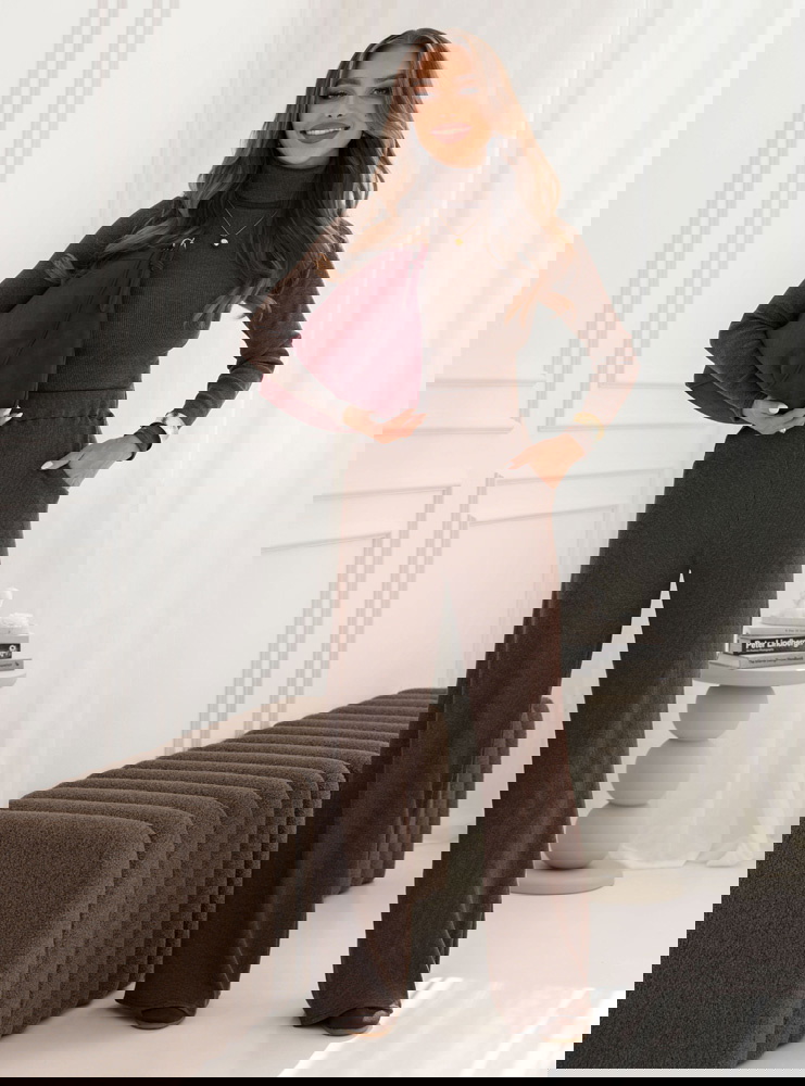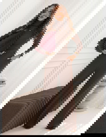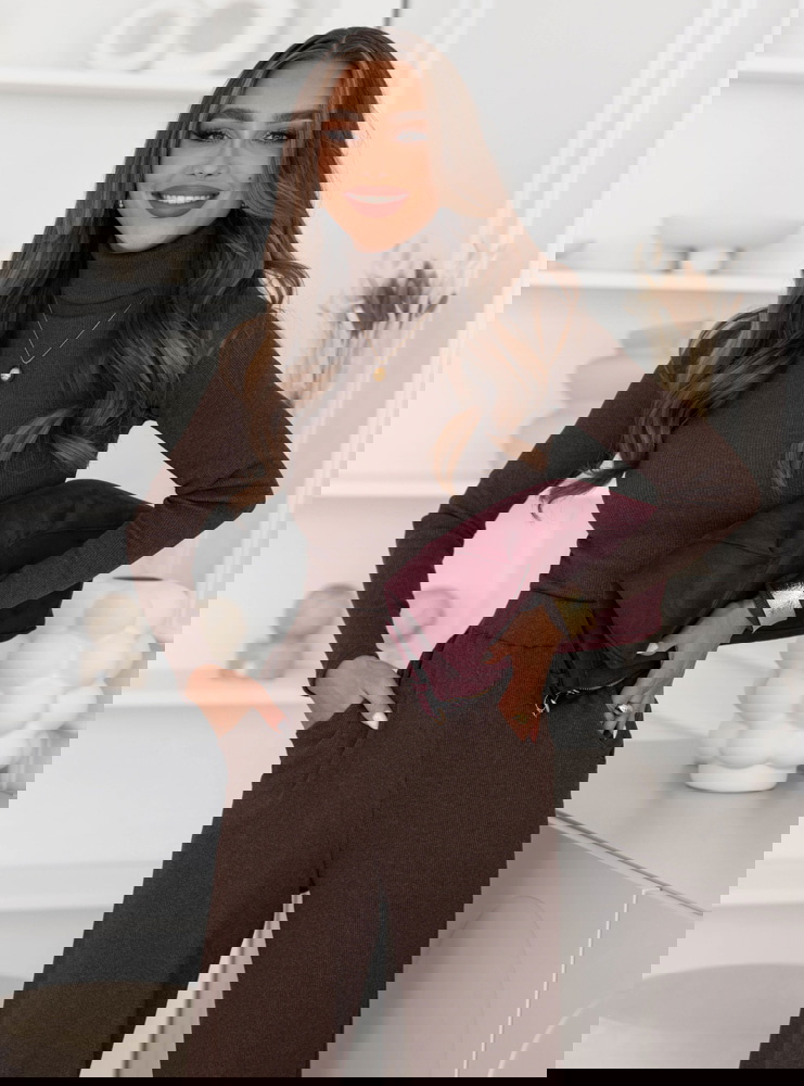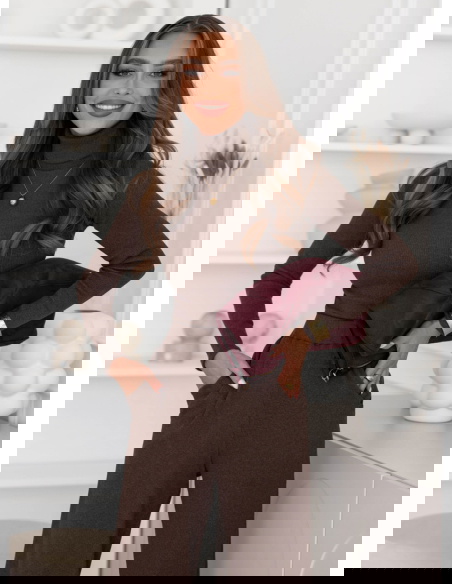 Czekoladowy prążkowany komplet bluzka z golfem i spodnie Carolann to kwintesencja jesiennego stylu. Łączy w sobie prostotę, klasę i wygodę, dzięki czemu sprawdzi się w wielu sytuacjach. Jego ponadczasowy charakter sprawia, że nigdy nie wyjdzie z mody.