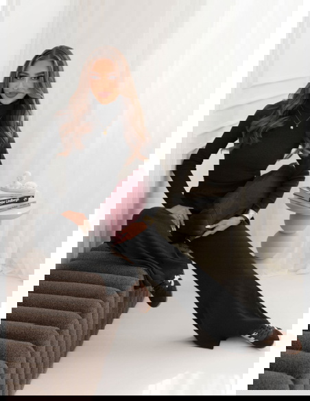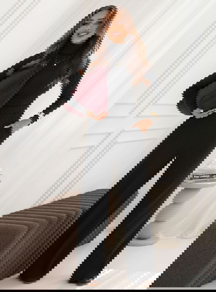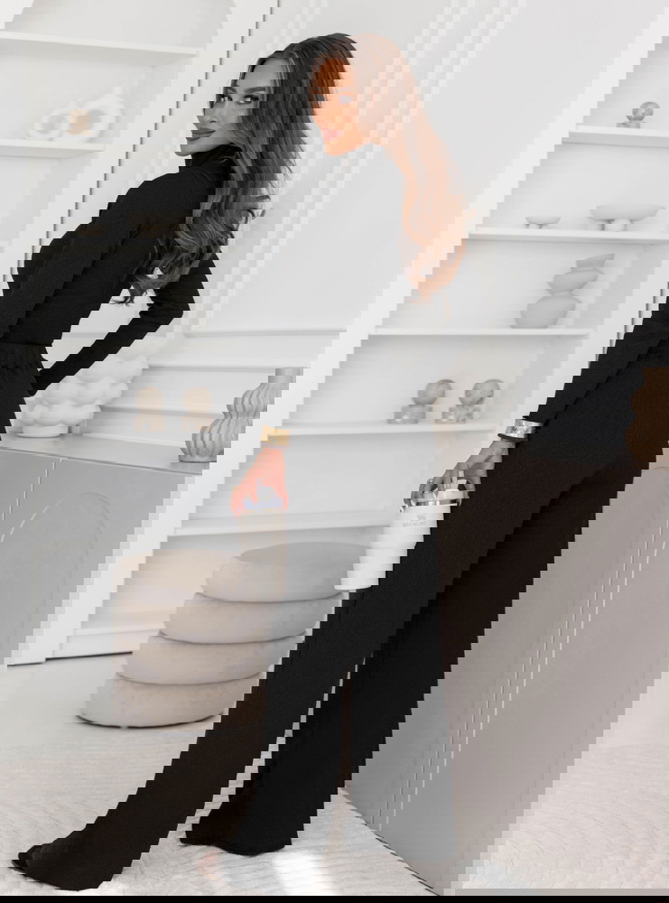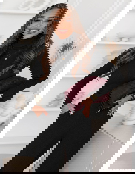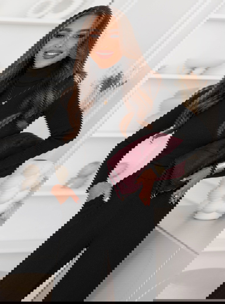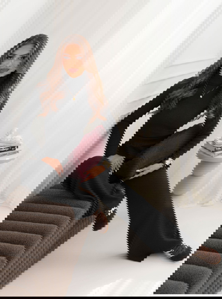 Czarny prążkowany komplet bluzka z golfem i spodnie Carolann to zestaw, który od pierwszego spojrzenia przyciąga uwagę swoją prostotą i ponadczasowym charakterem. Minimalistyczny design sprawia, że całość prezentuje się niezwykle elegancko, a zarazem wygodnie. Golf nadaje stylizacji subtelnej klasy, a jednocześnie sprawia, że wygląda ona spójnie i harmonijnie. To komplet, który świetnie wpisuje się w jesienny klimat – otula, dodaje stylu i pozwala poczuć się wyjątkowo w każdej sytuacji. Zestawienie bluzki i spodni w tym samym odcieniu czerni tworzy efekt modnej całości, która wysmukla sylwetkę. Luźniejsze spodnie kontrastują z dopasowaną górą, dzięki czemu look zyskuje idealne proporcje. Jest to wybór dla kobiet, które cenią sobie szyk w codziennym wydaniu. Komplet pozwala łatwo tworzyć zarówno proste, jak i bardziej wyraziste stylizacje, zależnie od dodatków. Czarna kolorystyka daje ogromne pole do eksperymentowania z akcesoriami – zarówno w odcieniach złota, burgundu, jak i głębokiej zieleni. To właśnie ten komplet stanie się bazą, po którą będziesz sięgać wyjątkowo często.