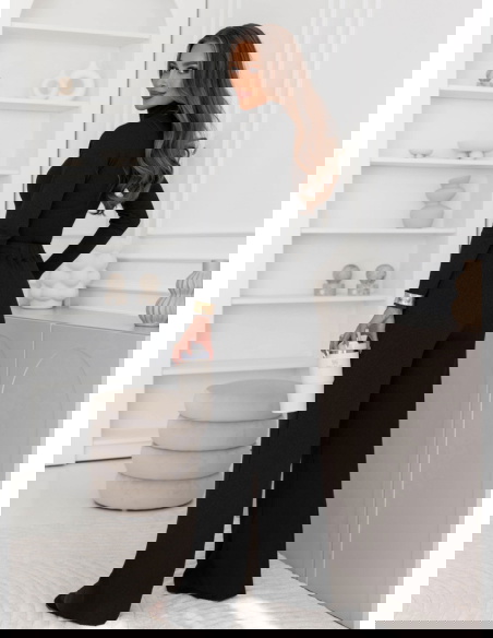 Czarny prążkowany komplet bluzka z golfem i spodnie Carolann