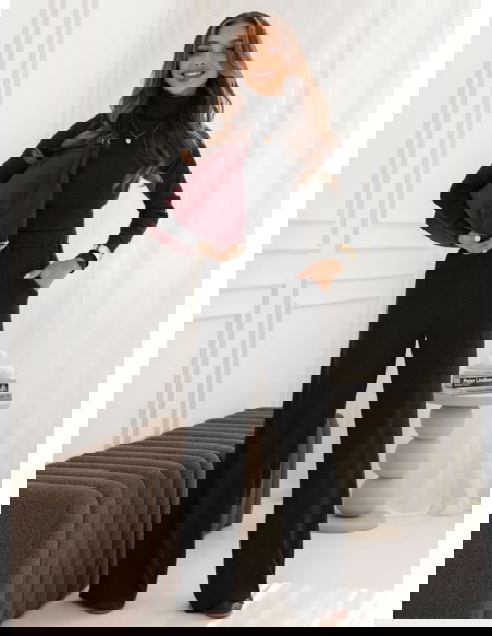 Czarny prążkowany komplet bluzka z golfem i spodnie Carolann świetnie sprawdzi się na co dzień, gdy chcesz wyglądać stylowo, a jednocześnie komfortowo. To idealna propozycja do pracy, kiedy liczy się nienachalna elegancja.