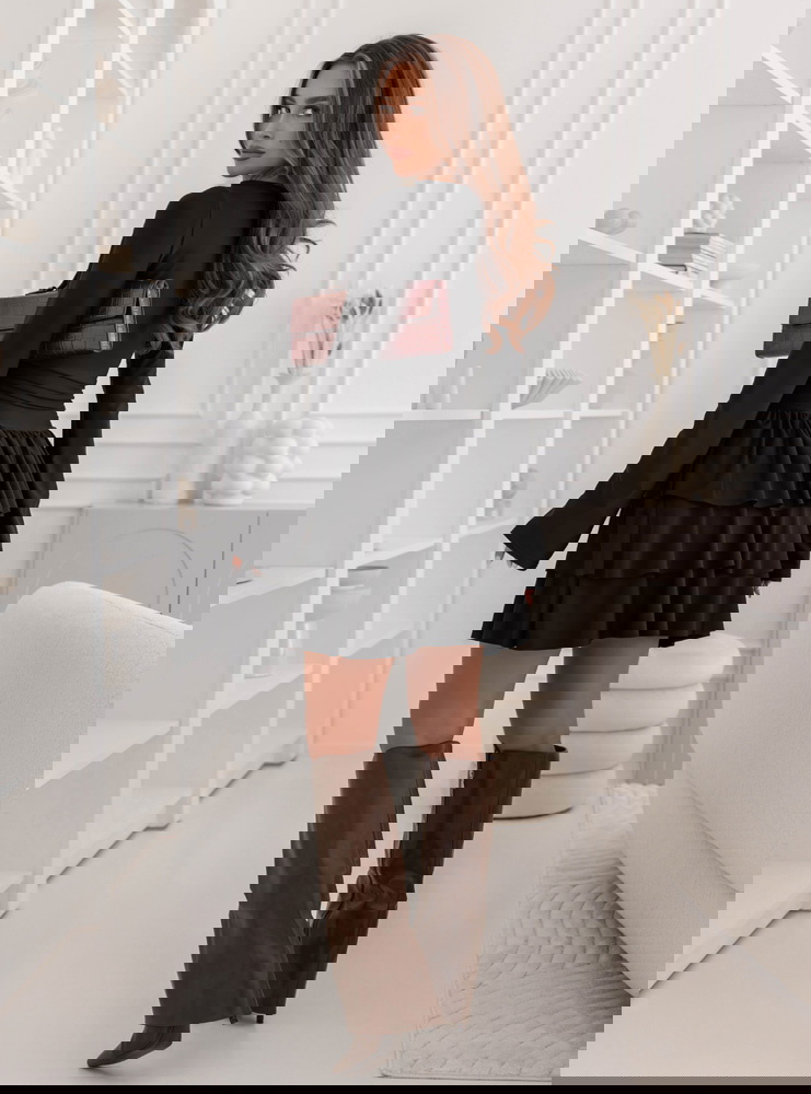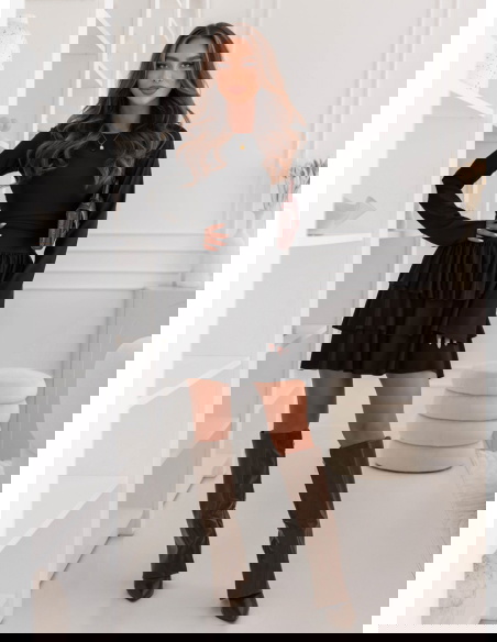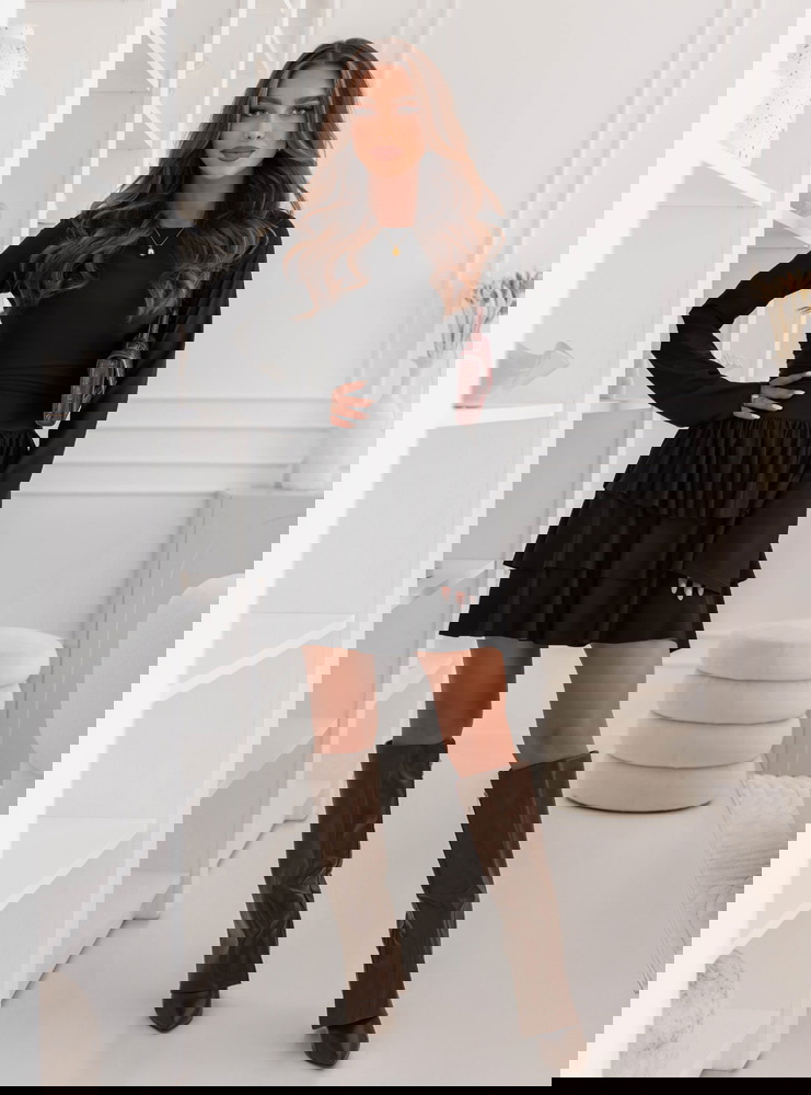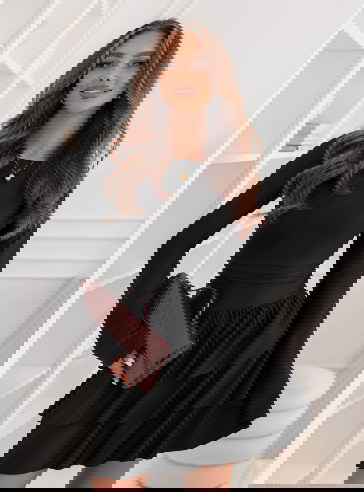 Czarny kombinezon jak sukienka z marszczeniami po bokach Anngeles to klasyka w nowoczesnym wydaniu. Jego ponadczasowy kolor sprawia, że jest niezwykle uniwersalny i pasuje na każdą okazję. Na pierwszy rzut oka wygląda jak elegancka sukienka, a jednocześnie gwarantuje wygodę kombinezonu. Marszczenia po bokach pięknie modelują sylwetkę, podkreślając kobiece kształty. Falbanowa, rozkloszowana część dolna dodaje lekkości i wdzięku. Długie rękawy wprowadzają elegancję, czyniąc go odpowiednim również na chłodniejsze dni. To model, który doskonale łączy wygodę z szykiem. Czarny kolor nadaje mu klasy, a prosty krój sprawia, że zawsze prezentuje się modnie. To propozycja, która pozwoli Ci wyróżnić się w subtelny sposób. W tym kombinezonie poczujesz się pewnie i wyjątkowo.