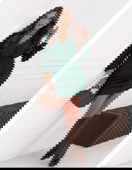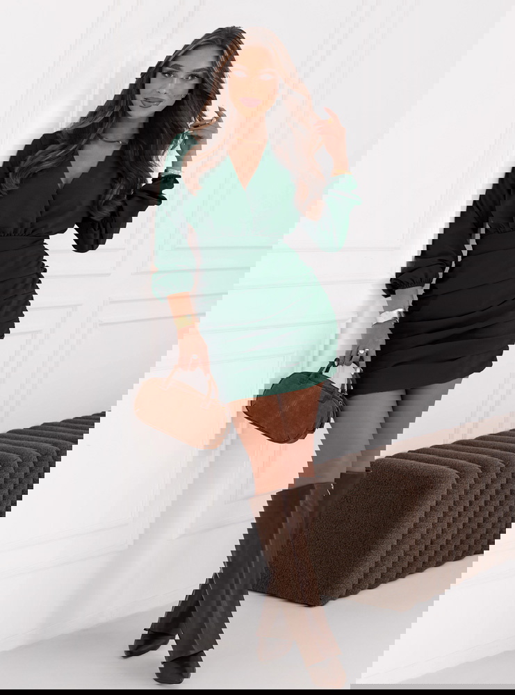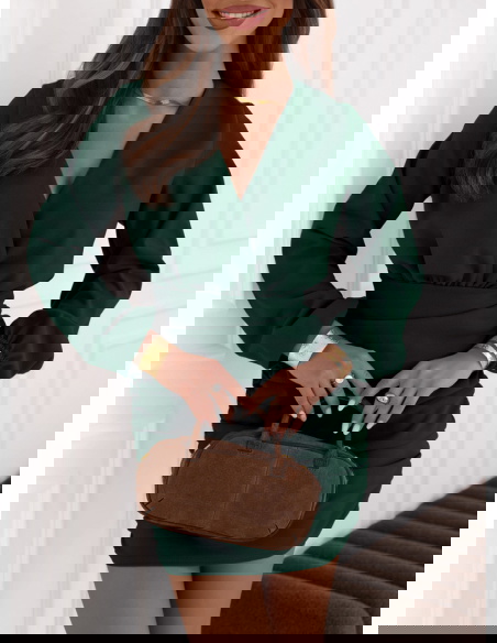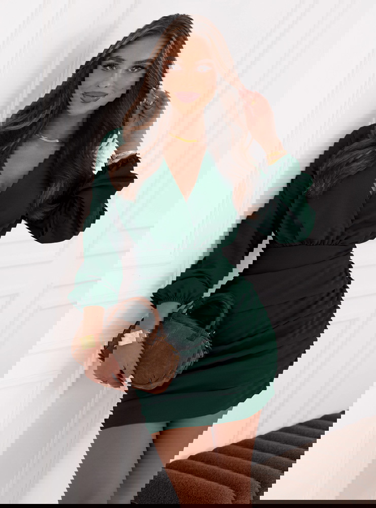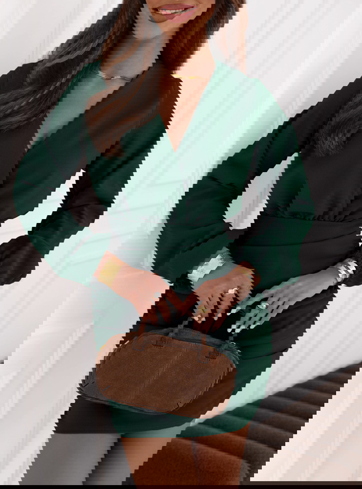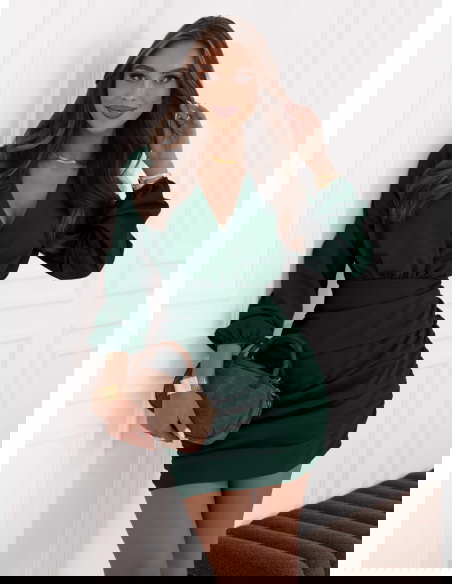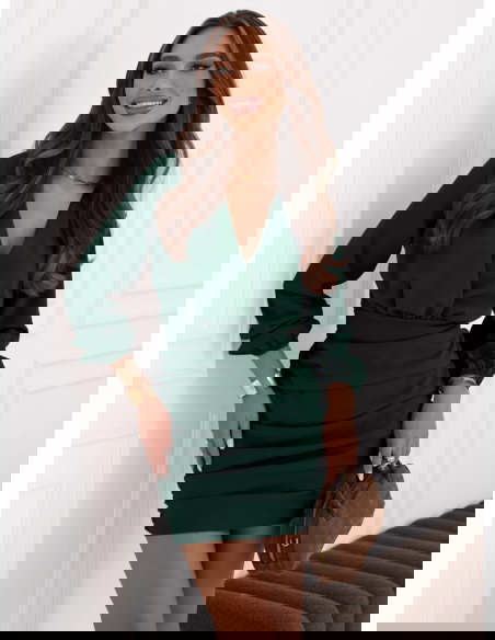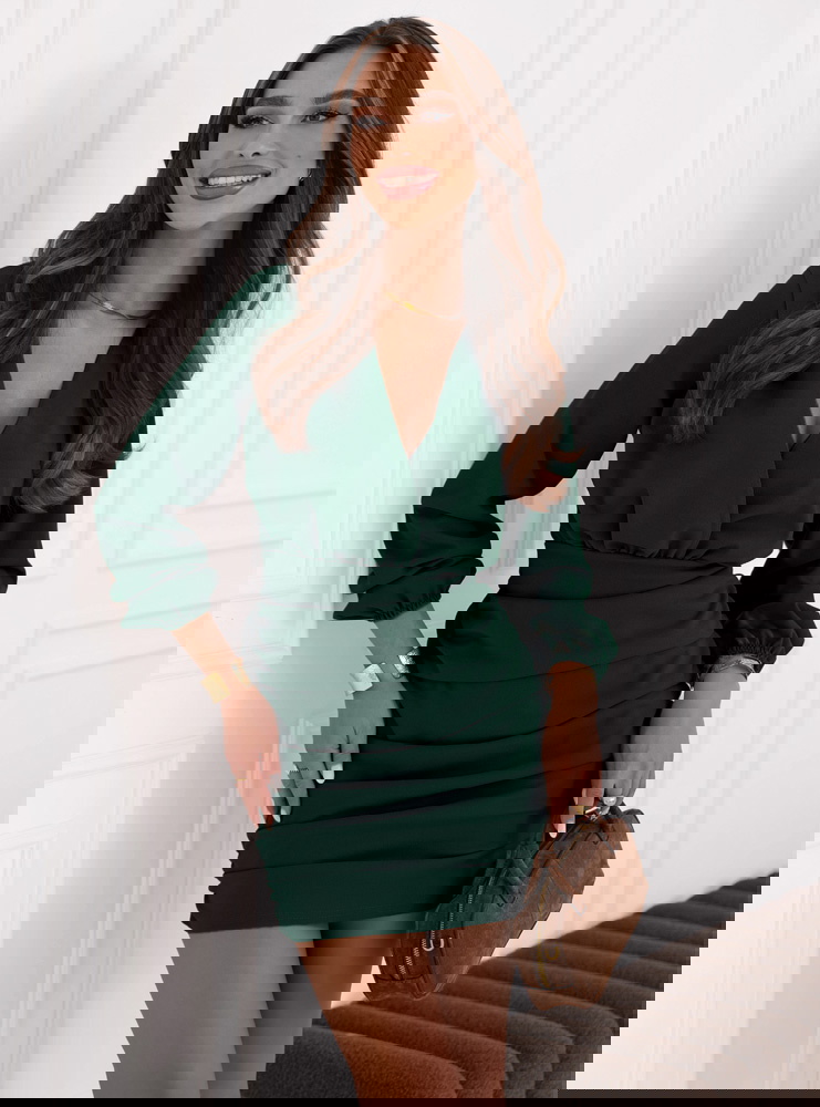Sukienka mini z przekładanym dekoltem Meridith - butelkowa zieleń świetnie sprawdzi się na wieczorne wyjścia. Będzie idealnym wyborem na romantyczną randkę, kiedy chcesz poczuć się wyjątkowo.