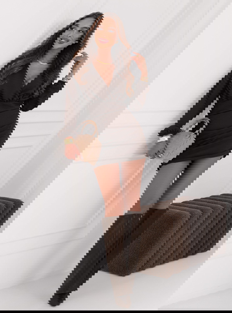 Czekoladowa sukienka mini z przekładanym dekoltem Meridith to idealne połączenie elegancji i kobiecego wdzięku. Jej głęboki odcień brązu nadaje całości klasycznego charakteru, jednocześnie wprowadzając nutę zmysłowości. Przekładany dekolt subtelnie eksponuje szyję i obojczyki, dodając stylizacji lekkości i finezji. Krótki fason podkreśla nogi, sprawiając, że całość prezentuje się bardzo kobieco. Długie rękawy nadają sukience równowagi, dzięki czemu jest ona nie tylko zmysłowa, ale także elegancka. Drapowania po boku dodają jej charakteru i optycznie modelują sylwetkę. To propozycja dla kobiet, które chcą wyglądać wyjątkowo podczas specjalnych okazji, a jednocześnie czuć się swobodnie. Czekoladowa kolorystyka sprawia, że sukienka pięknie komponuje się z dodatkami w złocie, beżu czy czerni. To model, który z łatwością dopasujesz zarówno do bardziej wyrazistych, jak i delikatnych akcentów. Dzięki niej każda stylizacja nabierze wyjątkowego uroku i niepowtarzalności.