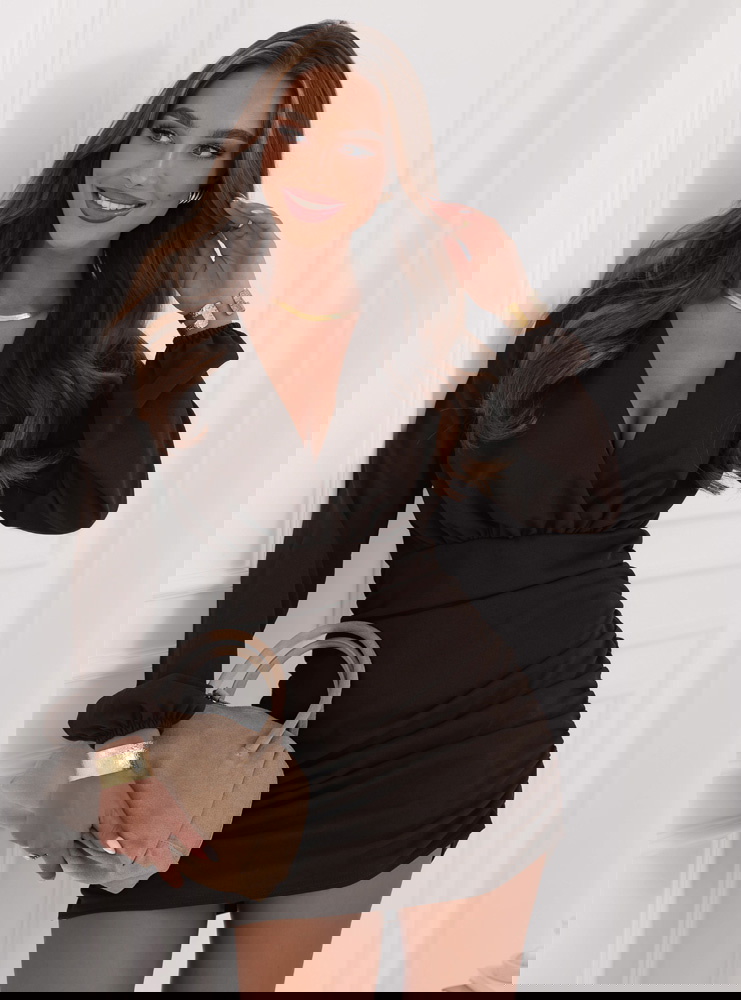 Czekoladowa sukienka mini z przekładanym dekoltem Meridith świetnie sprawdzi się na wieczorne wyjścia. To doskonały wybór na randkę, imprezę czy elegancką kolację.