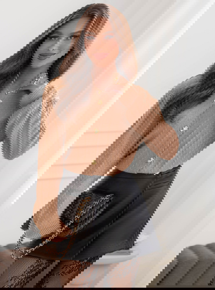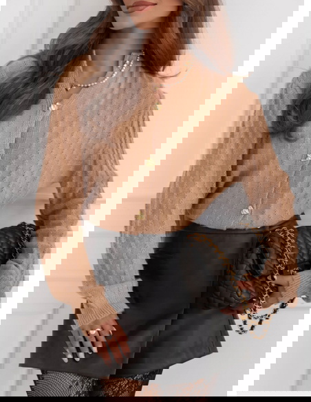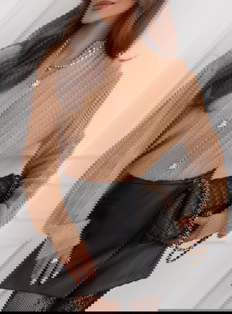 Sweter zapinany na guziki Francinaa - mocha mousse to połączenie klasyki i subtelnej elegancji. Jego prosty fason czyni go niezwykle uniwersalnym, a złote guziki w kształcie serc dodają mu wyjątkowego uroku.