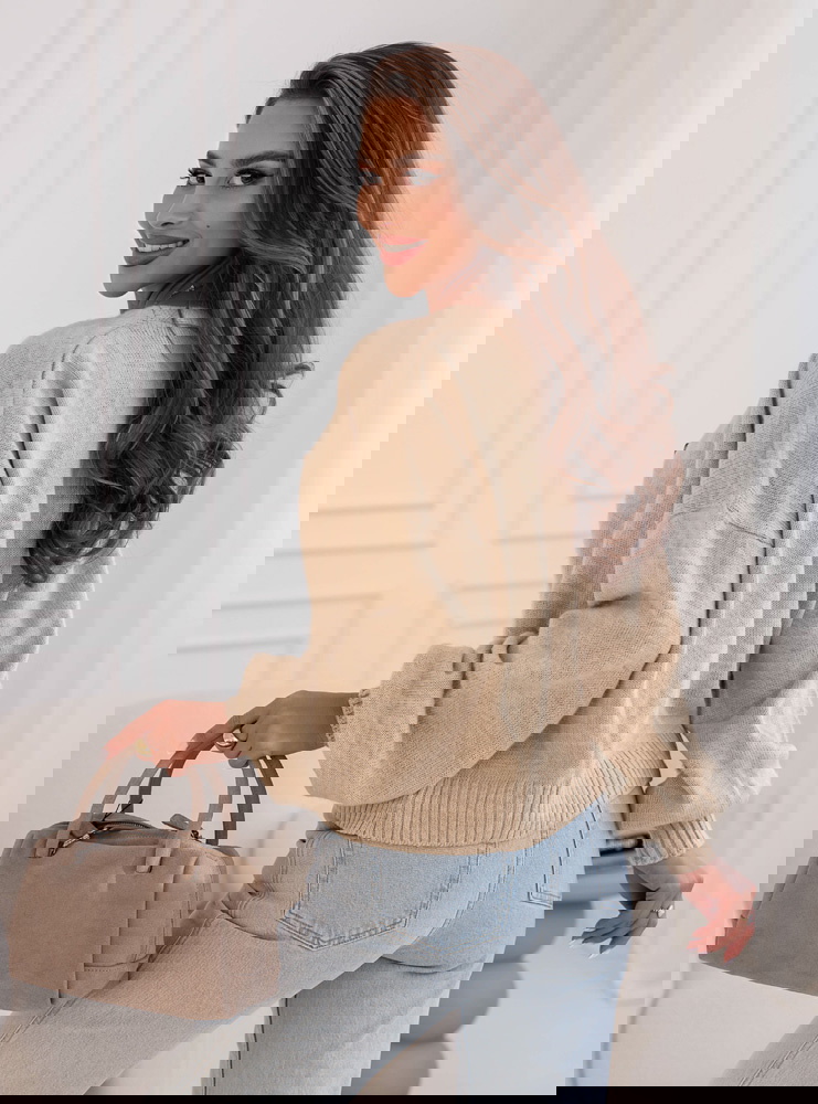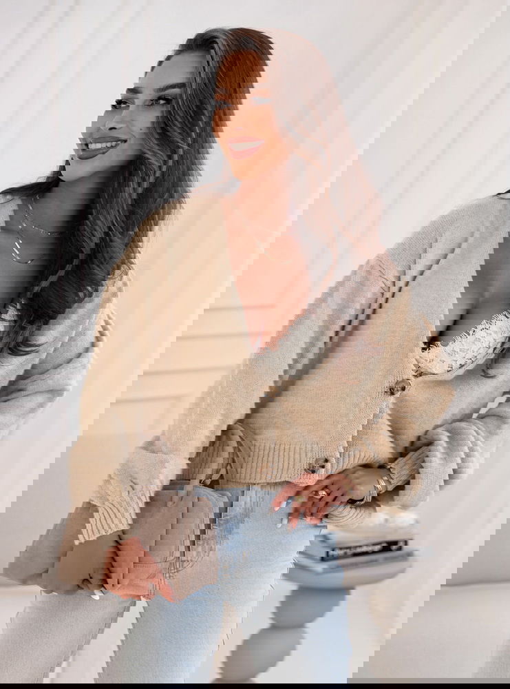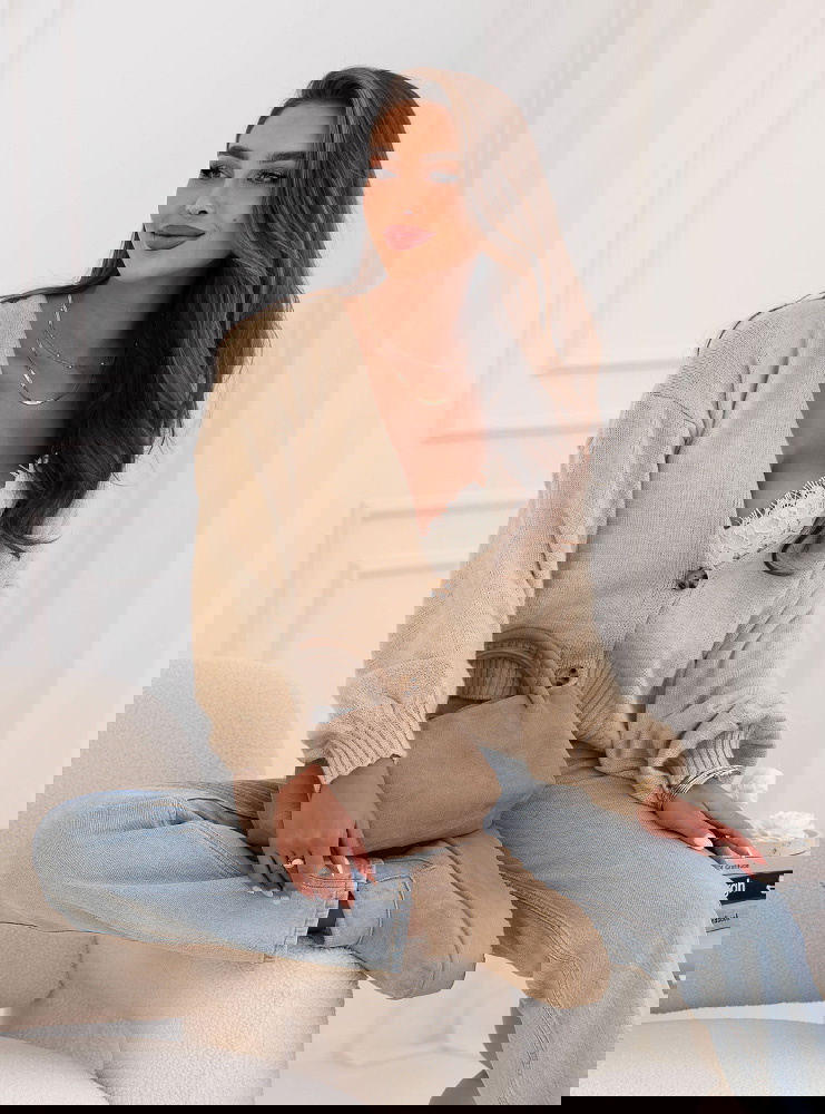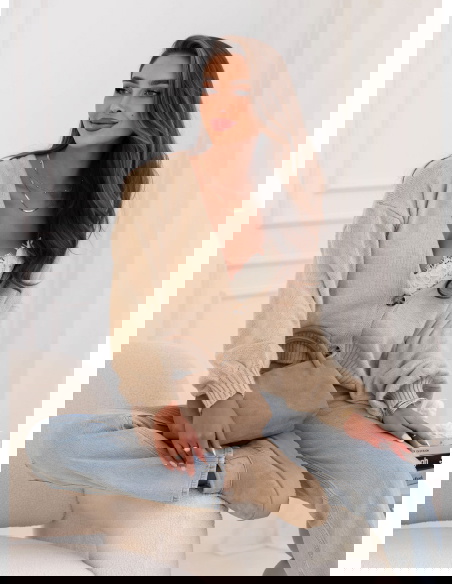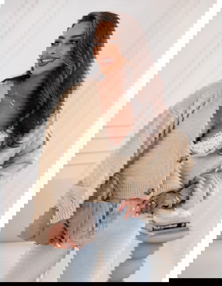 Beżowy sweter zapinany na guziki Elinoree to klasyka, która nigdy nie wychodzi z mody. Jego uniwersalny kolor sprawia, że pasuje do wielu stylizacji i świetnie wpisuje się w jesienny klimat. Luźniejszy fason nadaje mu swobody i lekkości, a jednocześnie sprawia, że wygląda stylowo i kobieco. Guziki z przodu dodają mu subtelnego charakteru i pozwalają nosić go na wiele sposobów – zarówno rozpięty, jak i zapięty. To model, który łączy w sobie prostotę i ponadczasową elegancję, idealną na chłodniejsze dni. Beżowy odcień przywodzi na myśl ciepło, przytulność i naturalność, co sprawia, że świetnie komponuje się z innymi barwami sezonu. To sweter, który doskonale podkreśla lekki, codzienny styl, a jednocześnie może być elementem bardziej wyrafinowanych zestawień. Dzięki niemu każda stylizacja zyskuje wyjątkowego charakteru. To ubranie, które nie tylko podkreśla Twój styl, ale także daje pełną swobodę w tworzeniu różnych outfitów.