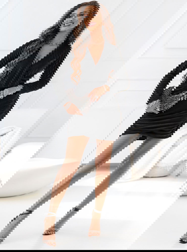 Czarna welurowa sukienka z marszczeniami po bokach Leshell to propozycja, która zachwyca elegancją i kobiecością. Jej fason został zaprojektowany tak, aby pięknie podkreślać sylwetkę i nadawać jej smukły kształt. Głęboki dekolt w kształcie kopertowym dodaje zmysłowego charakteru, a zarazem pozostaje subtelny i szykowny. Czarny kolor to klasyka, która nigdy nie wychodzi z mody i zawsze prezentuje się wyjątkowo. Marszczenia po bokach pełnią nie tylko dekoracyjną rolę, ale również modelują figurę, tworząc efekt wysmuklenia. Sukienka przyciąga uwagę swoją prostotą, która jednocześnie kryje w sobie ogromny urok. To wybór idealny na jesienne wieczory, kiedy chcemy czuć się wyjątkowo. Połączenie wygody z elegancją sprawia, że możesz w niej spędzić wiele godzin, czując się swobodnie. Model ten świetnie komponuje się z błyszczącą biżuterią i klasycznymi dodatkami. To sukienka, która będzie Twoim sprzymierzeńcem podczas wyjątkowych okazji.