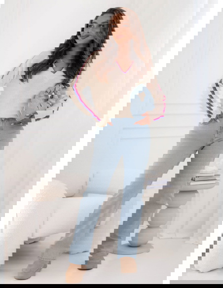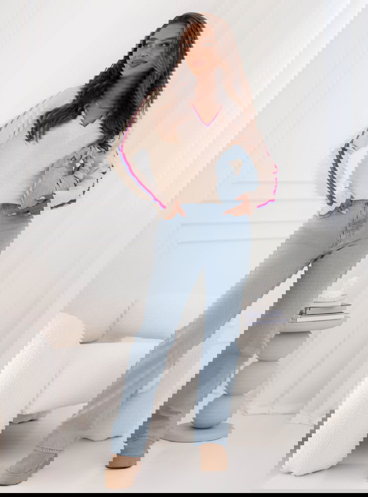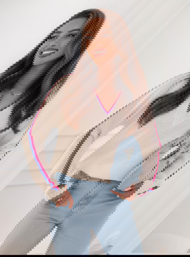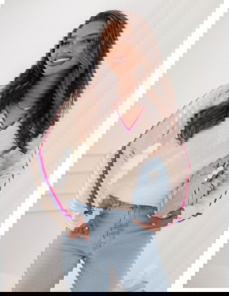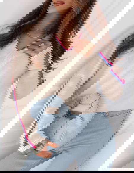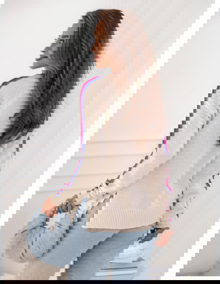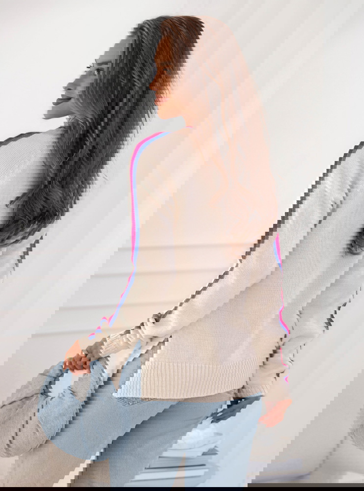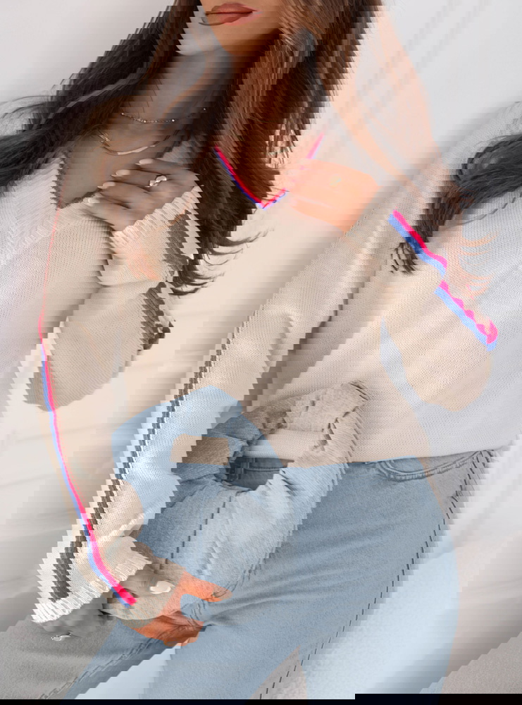 Sweter z dekoltem w serek Emerlie - wzór 1 to klasyk w nowoczesnym wydaniu, który idealnie wpisuje się w jesienny klimat. Jego luźny krój zapewnia wygodę, a jednocześnie podkreśla lekkość stylizacji. Dekolt w serek dodaje subtelnej kobiecości i świetnie komponuje się z biżuterią, zwłaszcza delikatnymi łańcuszkami. Kontrastowe paski na rękawach oraz przy dekolcie przełamują prostotę, nadając całości modnego i świeżego charakteru. To detal, który przyciąga wzrok i sprawia, że sweter wyróżnia się na tle bardziej klasycznych modeli. Jasny odcień świetnie rozświetla stylizacje, dzięki czemu wygląda stylowo zarówno w ciągu dnia, jak i wieczorem. To propozycja dla kobiet, które lubią łączyć wygodę z modnym designem. Sweter ma w sobie coś codziennego i zarazem wyjątkowego – można w nim czuć się swobodnie, ale i elegancko. Jest to wybór, który urozmaici każdą garderobę.