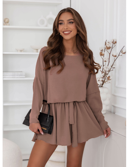 Kombinezon jak sukienka Rosalline - mocha mousse to propozycja, która łączy w sobie elegancję i wygodę w najlepszym wydaniu. Jego subtelny, stonowany kolor wprowadza spokój i ciepło, idealnie wpisując się w jesienną estetykę. Luźny krój sprawia, że całość prezentuje się lekko i swobodnie, a jednocześnie zachowuje kobiecy charakter. Delikatny dekolt i długie rękawy dodają mu klasy, dzięki czemu wygląda niezwykle szykownie. Wiązanie w talii pięknie podkreśla sylwetkę, nadając jej proporcji i delikatnej elegancji. To model, który nie wymaga wielu dodatków – sam w sobie wygląda stylowo i modnie. Świetnie układa się w ruchu, dzięki czemu nadaje lekkości każdemu kroku. Jego krótki fason subtelnie eksponuje nogi, tworząc zmysłowy, ale wciąż wyważony efekt. Ten kombinezon to idealna równowaga pomiędzy prostotą a kobiecą finezją.