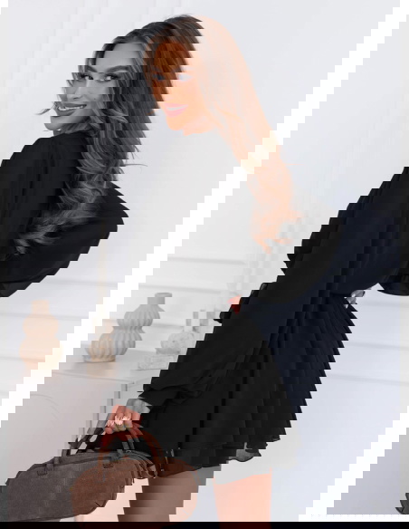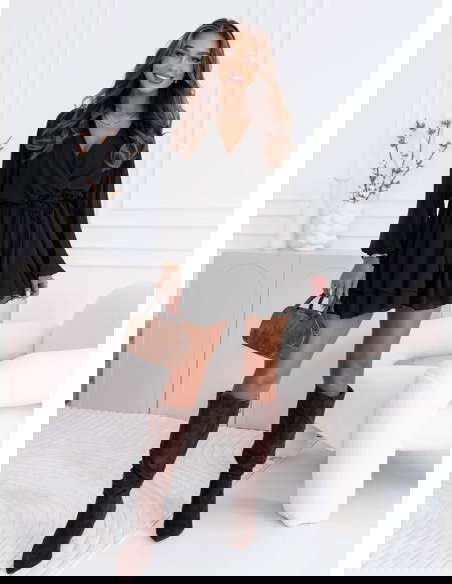 Czarna szyfonowa sukienka mini z przekładanym dekoltem Destinie to kwintesencja elegancji w kobiecym, subtelnym wydaniu. Jej lekkość i zwiewność sprawiają, że wygląda niezwykle efektownie przy każdym ruchu. Delikatny materiał miękko układa się na sylwetce, podkreślając jej naturalny kształt. Przekładany dekolt dodaje całości klasy i wdzięku, a zarazem wprowadza delikatny, zmysłowy akcent. Sukienka posiada wiązanie w talii, które pozwala idealnie dopasować ją do figury i podkreślić kobiece proporcje. Długie, lekko bufiaste rękawy nadają jej romantycznego charakteru i sprawiają, że całość wygląda niezwykle lekko. Dwuwarstwowy dół z delikatnymi falbanami dodaje ruchu i wdzięku, tworząc efekt subtelnego powiewu. To model, który zachwyca prostotą, a jednocześnie przyciąga wzrok swoją formą. Idealny wybór dla kobiet ceniących elegancję, ale także wygodę i swobodę w stylu.