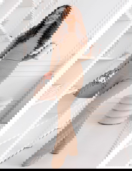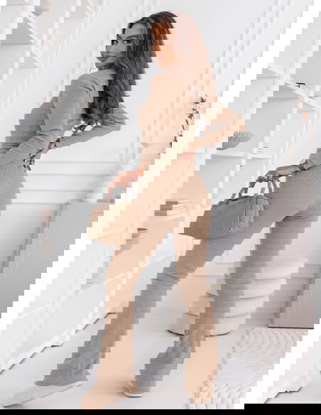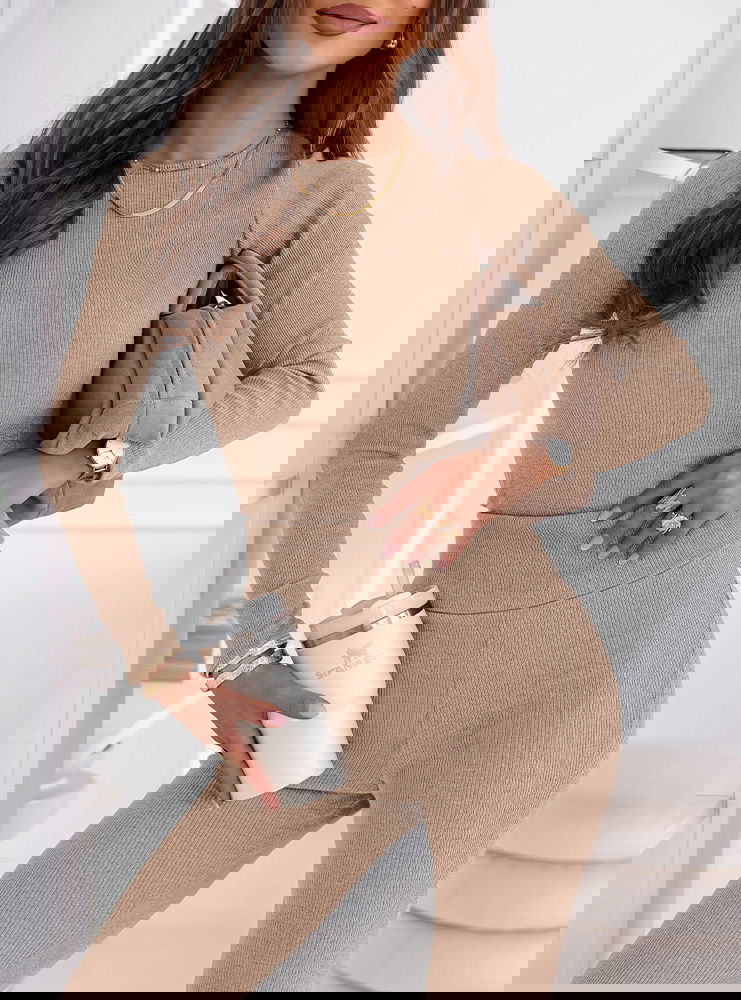 Beżowy prążkowany komplet dopasowana bluzka i spodnie Yamileth