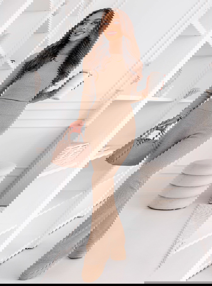 Beżowy prążkowany komplet dopasowana bluzka i spodnie Yamileth to propozycja, która łączy w sobie nowoczesny minimalizm i kobiecą elegancję. Ciepły, stonowany odcień beżu wprowadza do stylizacji spokój i subtelność, idealnie wpisując się w jesienny klimat. Dopasowana bluzka podkreśla figurę, zachowując przy tym klasyczną prostotę i wygodę. Spodnie z rozszerzanymi nogawkami pięknie wysmuklają sylwetkę i dodają całości lekko retro charakteru. To komplet, który zachwyca swoją harmonią i ponadczasowością. Idealny dla kobiet, które lubią wyglądać elegancko bez wysiłku. Każdy element został zaprojektowany tak, by tworzyć spójną i stylową całość. Komplet doskonale sprawdza się zarówno w codziennych stylizacjach, jak i w bardziej dopracowanych zestawieniach. Wystarczy dobrać odpowiednie dodatki, by w kilka chwil zmienić charakter całego looku. To model, który łączy wygodę domową z miejskim szykiem, tworząc perfekcyjny balans między komfortem a elegancją.