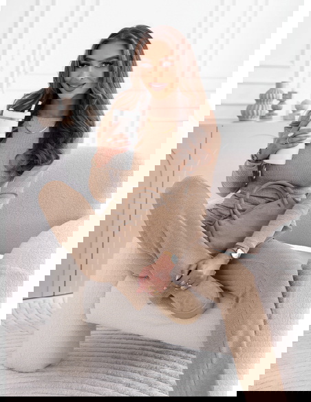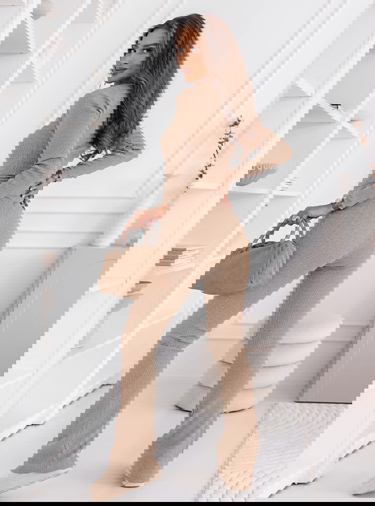 Beżowy prążkowany komplet dopasowana bluzka i spodnie Yamileth to esencja nowoczesnej kobiecości. Prosty, ale przemyślany fason idealnie podkreśla sylwetkę i zapewnia wygodę każdego dnia.