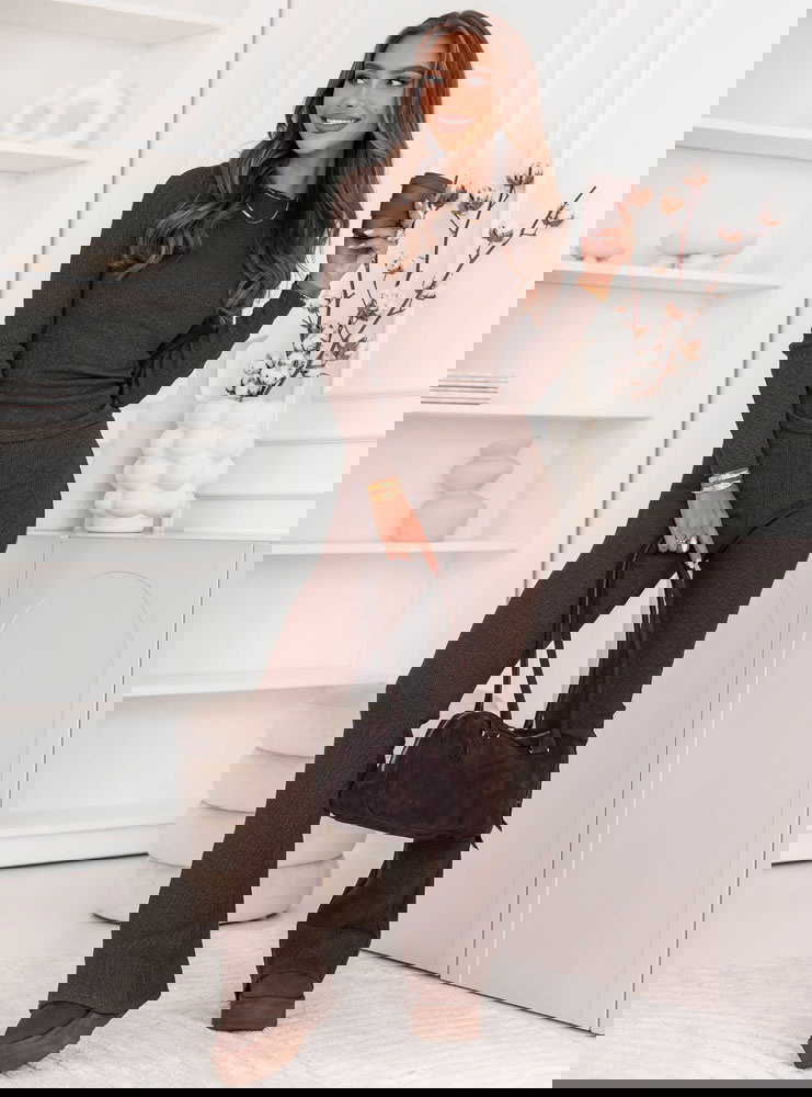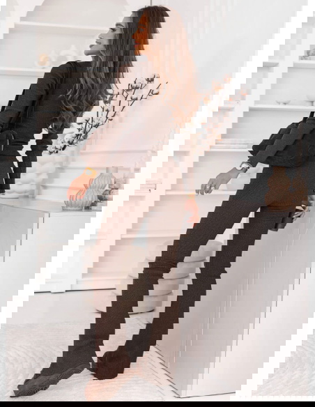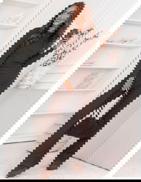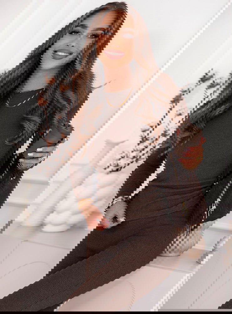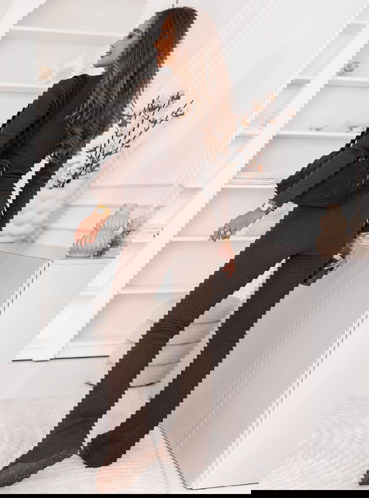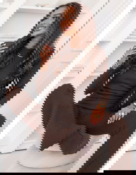 Czekoladowy prążkowany komplet dopasowana bluzka i spodnie Yamileth to kwintesencja nowoczesnego, kobiecego stylu w jesiennym wydaniu. Ten zestaw zachwyca prostotą, która podkreśla figurę i dodaje pewności siebie. Dopasowana bluzka o klasycznym kroju pięknie przylega do ciała, podkreślając talię i linię ramion. Spodnie z rozszerzanymi nogawkami to powrót do mody z nutą retro, który jednocześnie wydłuża nogi i wysmukla sylwetkę. Czekoladowy odcień nadaje całości elegancji, ale też wprowadza ciepło i głębię – idealnie wpisując się w klimat chłodniejszych dni. Komplet prezentuje się stylowo zarówno solo, jak i w towarzystwie płaszcza, kamizelki czy ulubionej torebki. To propozycja, która łączy wygodę z modnym wykończeniem, sprawiając, że każda stylizacja nabiera klasy. Całość wygląda wyjątkowo harmonijnie, tworząc spójny i elegancki look. W tym zestawie poczujesz się kobieco, nowocześnie i z klasą – niezależnie od okazji.