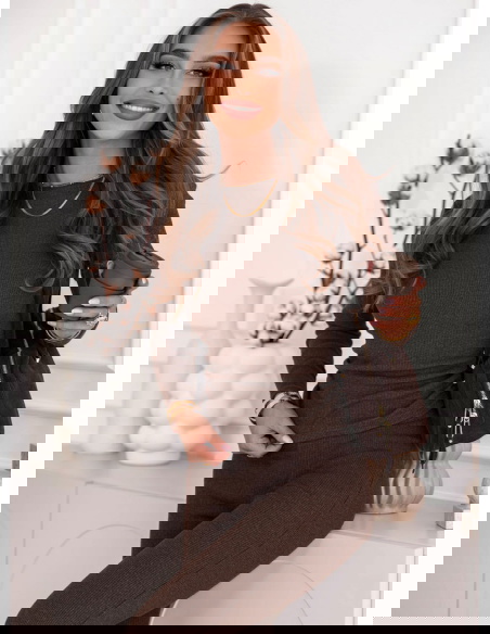 Czekoladowy prążkowany komplet dopasowana bluzka i spodnie Yamileth