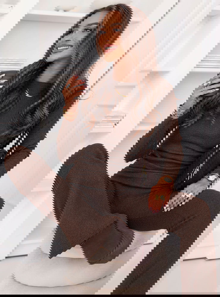Czekoladowy prążkowany komplet dopasowana bluzka i spodnie Yamileth to połączenie stylu, kobiecości i wygody. Jego dopasowany fason pięknie podkreśla sylwetkę, a rozszerzane nogawki nadają całości lekkości i nowoczesności.