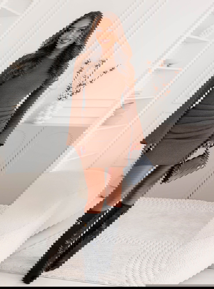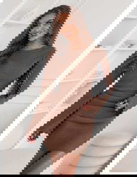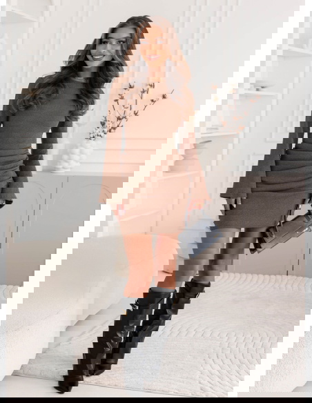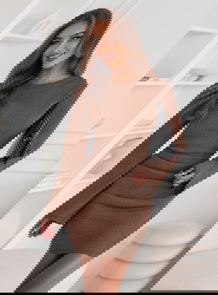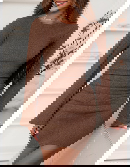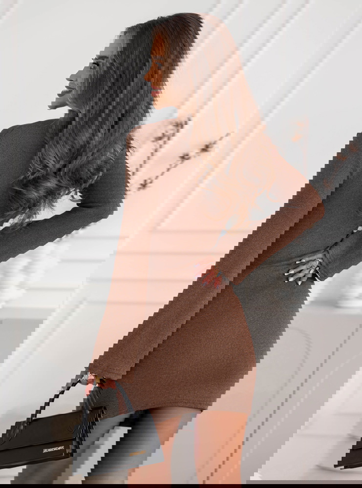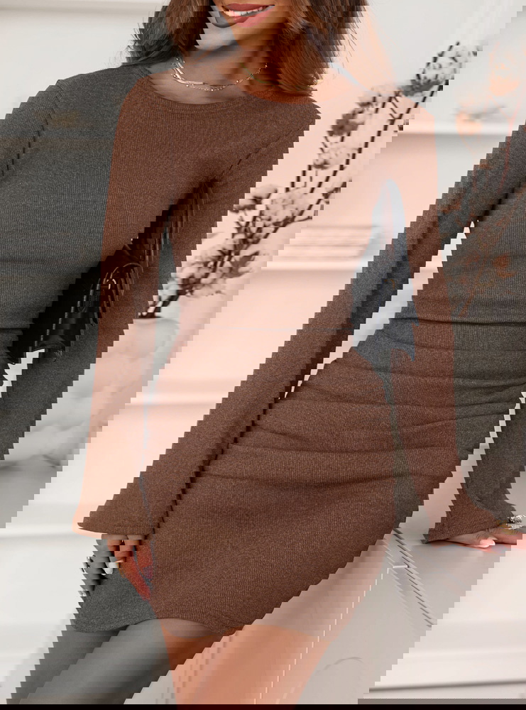 Prążkowana sukienka mini Jodele - mocha mousse to połączenie prostoty, kobiecości i subtelnej elegancji. Jej dopasowany fason pięknie podkreśla figurę, akcentując talię i nadając sylwetce wyjątkowej harmonii. To model, który łączy w sobie klasykę i nowoczesność, dzięki czemu pasuje do wielu stylizacji. Ciepły, czekoladowy odcień mocha mousse doskonale wpisuje się w jesienny klimat, dodając stylizacji przytulności i wyrafinowania. Długie rękawy równoważą długość mini, tworząc zrównoważony, elegancki efekt. Subtelne marszczenia w okolicy bioder nadają całości delikatnego charakteru i optycznie modelują sylwetkę. Sukienka jest uniwersalna – sprawdzi się zarówno w codziennych zestawieniach, jak i w bardziej szykownych stylizacjach. Wystarczy zmienić dodatki, by nadać jej zupełnie inny nastrój. To doskonały wybór dla kobiet, które lubią wyglądać stylowo, ale cenią też wygodę i swobodę ruchów. Całość emanuje naturalnym urokiem i ponadczasową klasą.