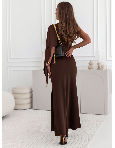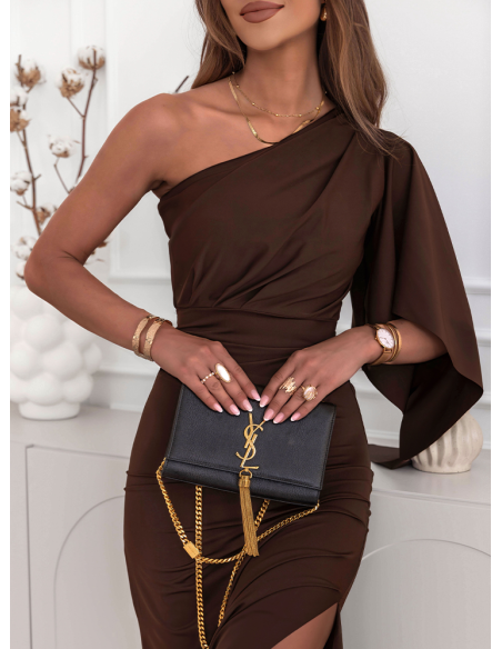 Czekoladowa sukienka na jedno ramię z rozcięciem Nunize to połączenie klasy, nowoczesności i kobiecej siły. Asymetryczny krój i głęboki odcień brązu tworzą elegancki, ale zmysłowy efekt.