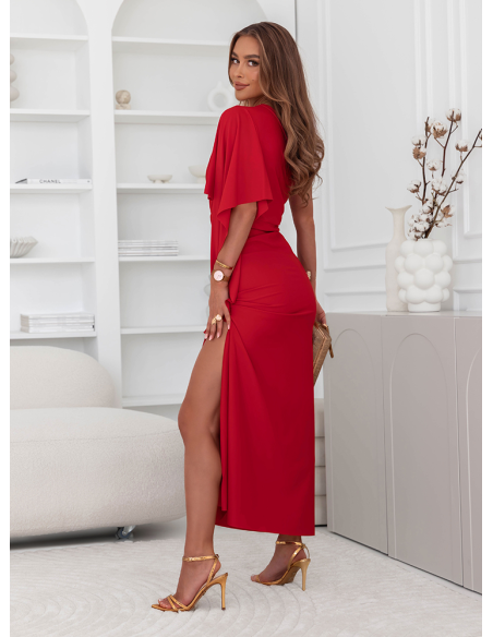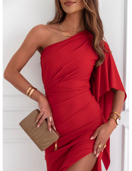 Malinowa sukienka na jedno ramię z rozcięciem Nunize