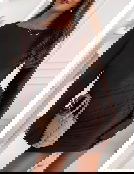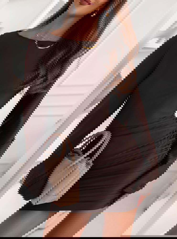 Czekoladowa dopasowana sukienka mini z marszczeniami po bokach Effney