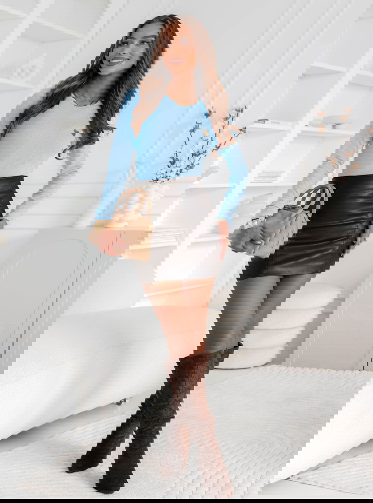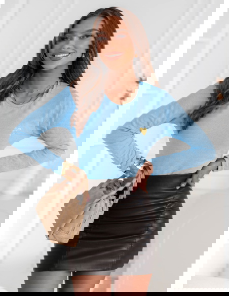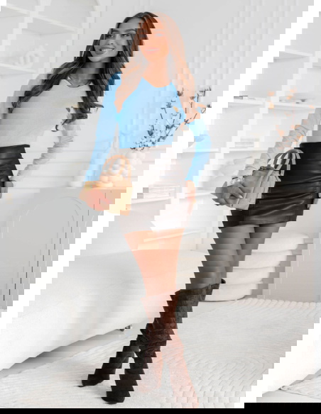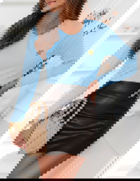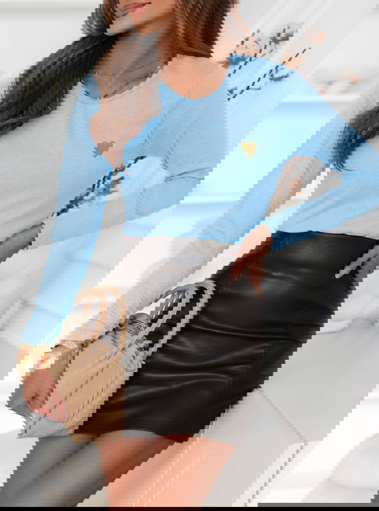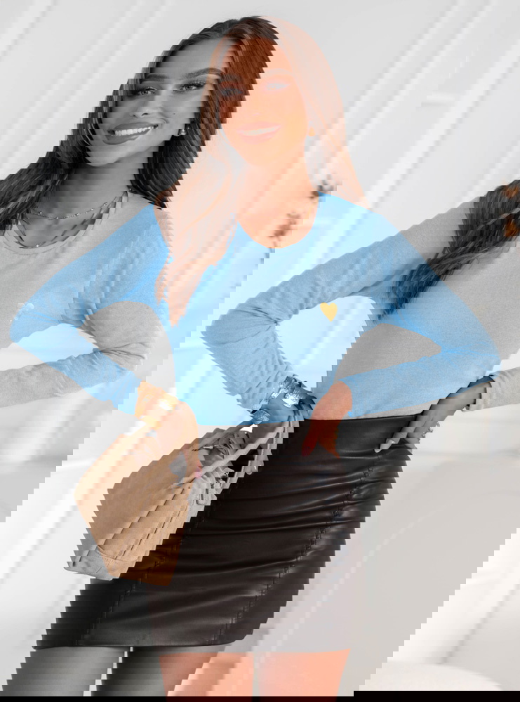 Błękitna koszulka na długi rękaw z ozdobnym nadrukiem Jennabel to subtelna, ale efektowna propozycja dla kobiet, które lubią połączenie prostoty i elegancji. Delikatny, pastelowy odcień błękitu wprowadza świeżość i lekkość do każdej stylizacji. Złoty nadruk w kształcie serca stanowi gustowny detal, który dodaje całości wyjątkowego uroku. To model, który idealnie sprawdzi się w codziennych stylizacjach, ale także w bardziej dopracowanych zestawieniach. Dopasowany krój podkreśla sylwetkę, a miękka linia ramion nadaje kobiecego wdzięku. Koszulka wygląda pięknie zarówno samodzielnie, jak i w połączeniu z marynarką, płaszczem czy kamizelką. Pastelowy kolor świetnie współgra z beżami, brązami i bielą, tworząc modne, harmonijne zestawienia. To klasyka w nowoczesnym wydaniu, która sprawia, że nawet najprostszy outfit nabiera stylowego charakteru. Błękit przyciąga uwagę swoją świeżością, jednocześnie zachowując delikatność i elegancję. To koszulka, która z łatwością stanie się jednym z ulubionych elementów Twojej garderoby.