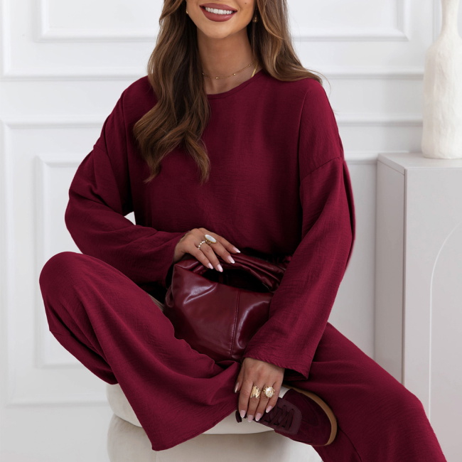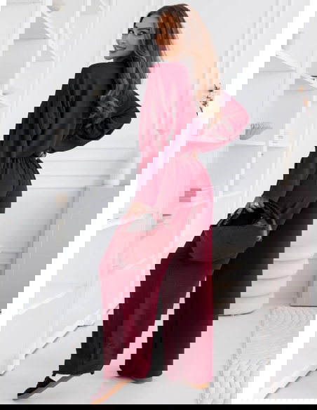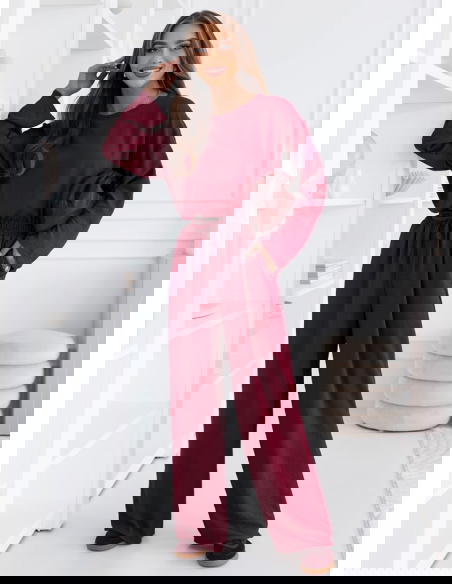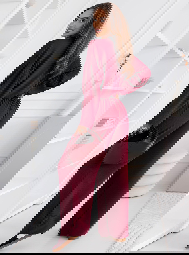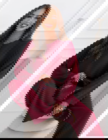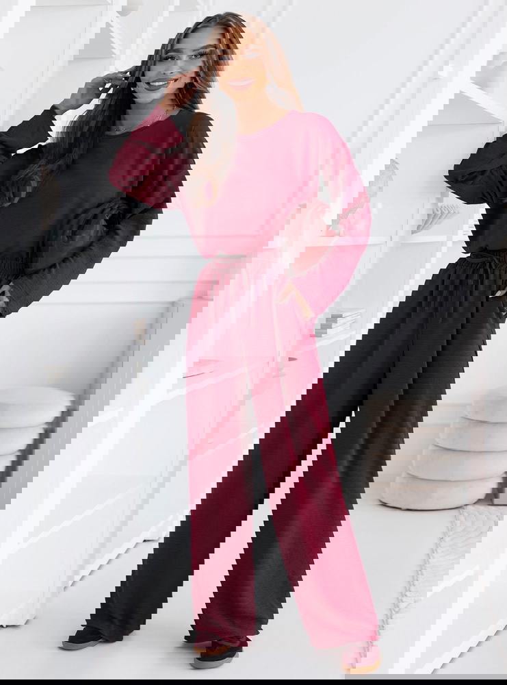 Bordowy komplet bluzka i spodnie Shalina sprawdzi się idealnie na wiele okazji. Możesz założyć go na co dzień, do pracy, na zakupy czy spotkanie ze znajomymi. Świetnie prezentuje się także w bardziej eleganckim wydaniu – wystarczy dodać biżuterię i buty na obcasie.