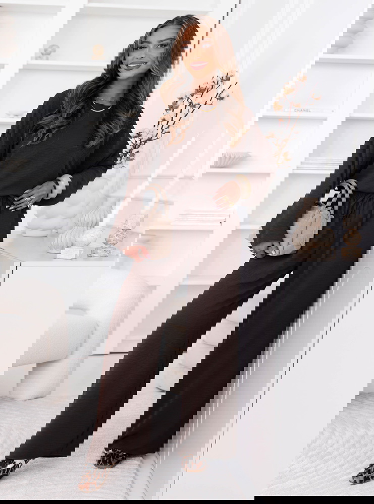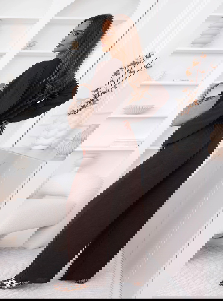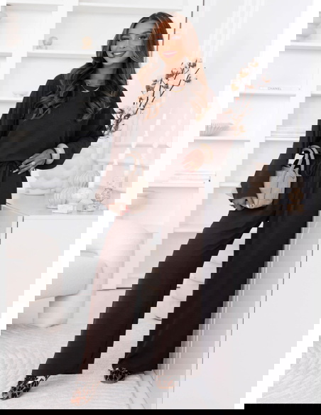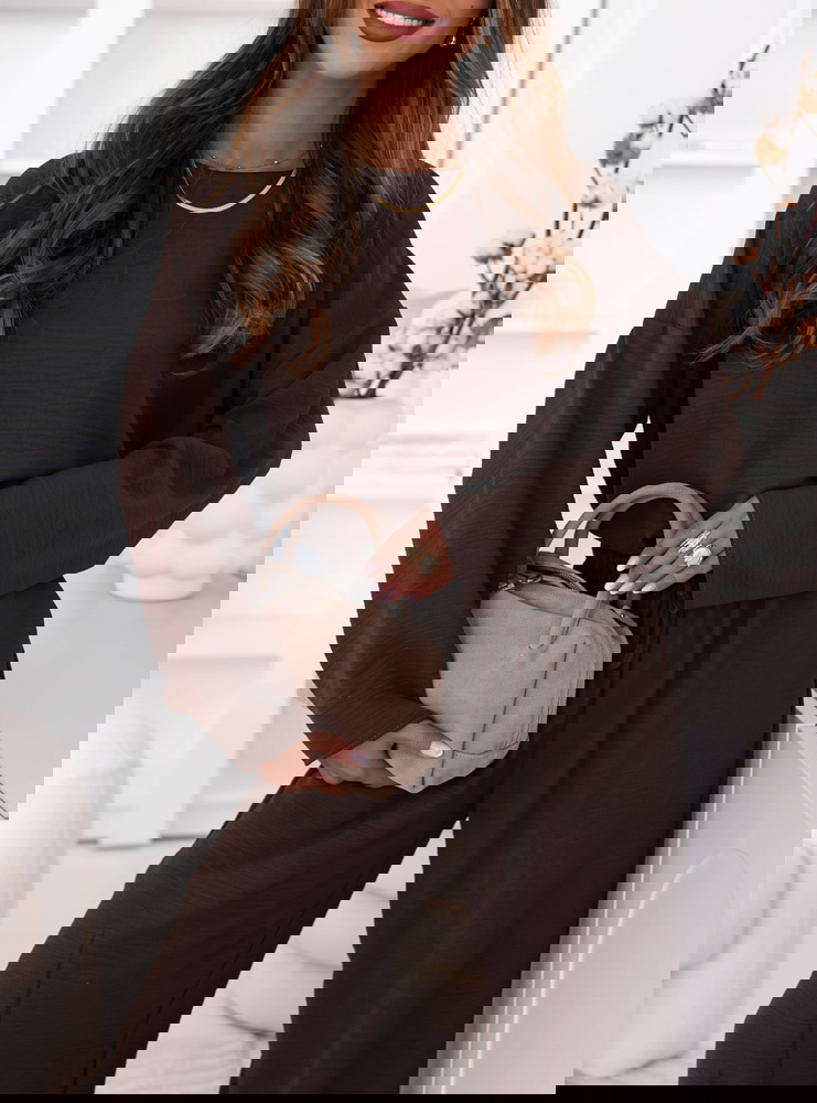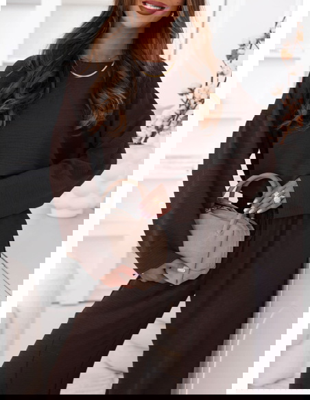 Czekoladowy komplet bluzka i spodnie Shalina to doskonałe połączenie prostoty, elegancji i wygody. Jego uniwersalny fason sprawia, że możesz go stylizować na wiele sposobów – od casualowych po bardziej eleganckie.