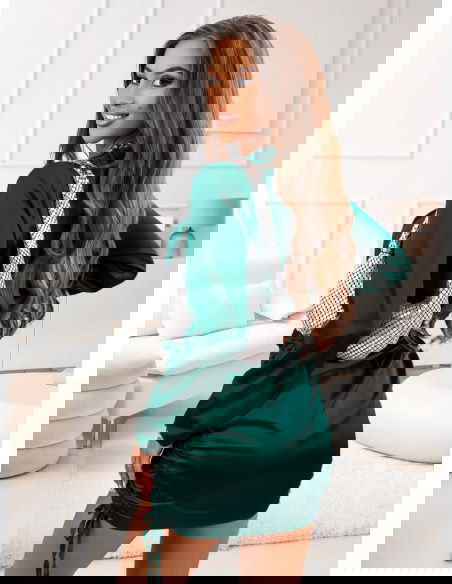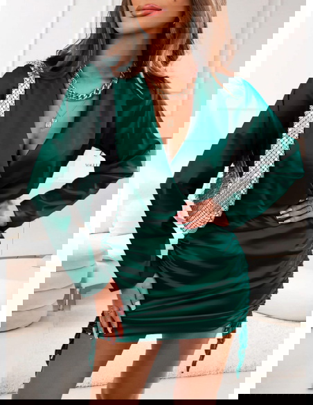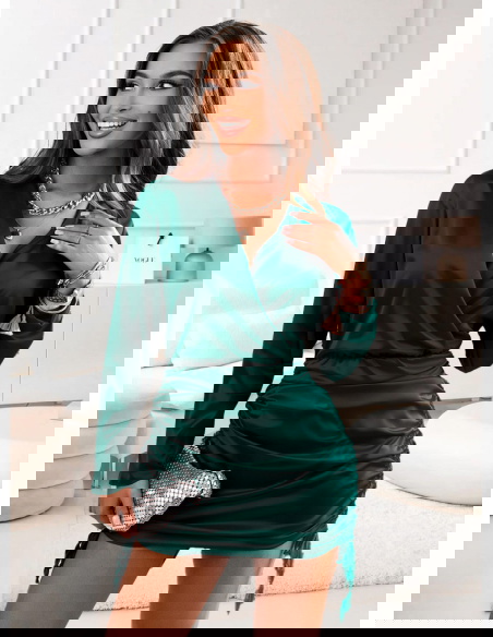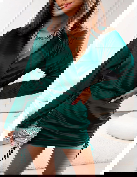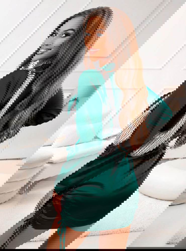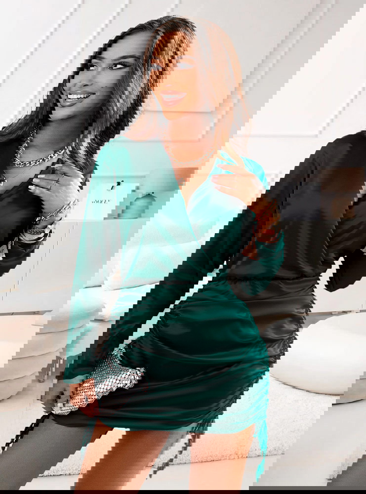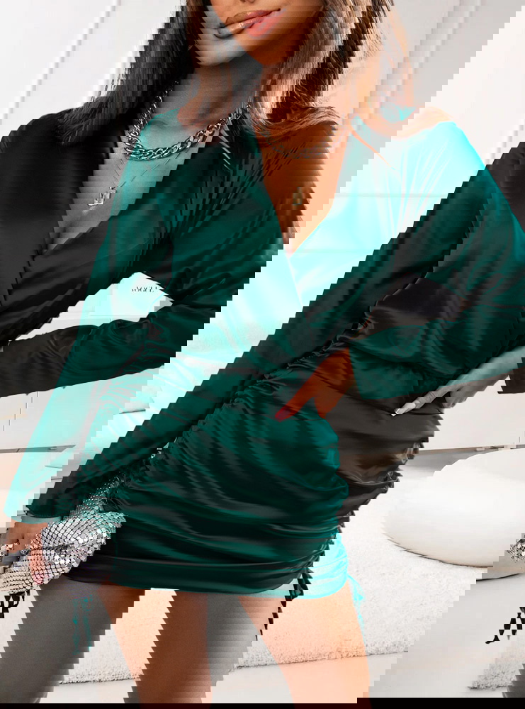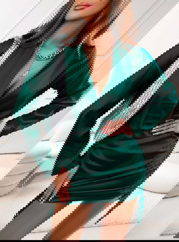 Satynowa sukienka ze ściągaczami po bokach Mareesa - butelkowa zieleń to wyjątkowa propozycja, która łączy elegancję z kobiecym wdziękiem. Jej głęboki odcień zieleni przyciąga spojrzenia i pięknie podkreśla urodę. Satynowe wykończenie nadaje całości luksusowego charakteru, a subtelny połysk sprawia, że wygląda niezwykle efektownie. Dopasowany fason podkreśla sylwetkę, a ściągacze po bokach pozwalają dopasować długość sukienki do własnych preferencji. Przekładany dekolt dodaje całości zmysłowości i klasy, a długie rękawy równoważą całość, nadając elegancki ton. To model, który idealnie sprawdzi się podczas wyjątkowych okazji, ale też na wieczorne wyjścia, gdy chcesz poczuć się wyjątkowo. Butelkowa zieleń to kolor, który emanuje elegancją i pewnością siebie. Każdy detal tej sukienki został stworzony po to, by podkreślić Twoją kobiecość w najlepszym wydaniu. To kreacja, która robi wrażenie od pierwszego spojrzenia i sprawia, że trudno przejść obok niej obojętnie.