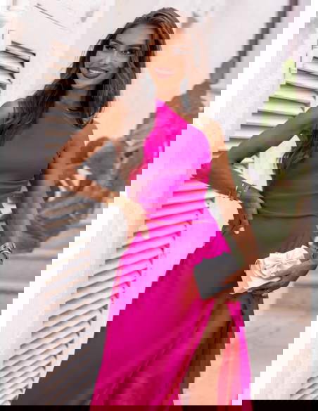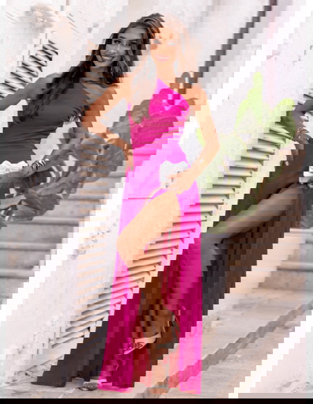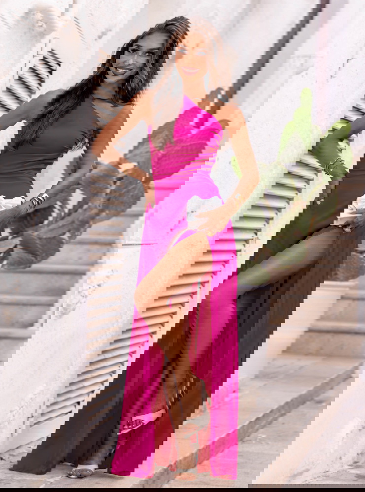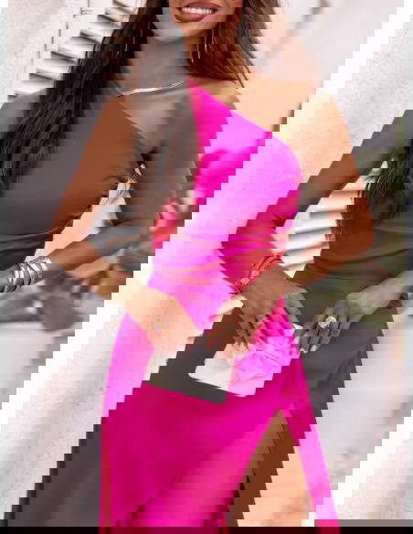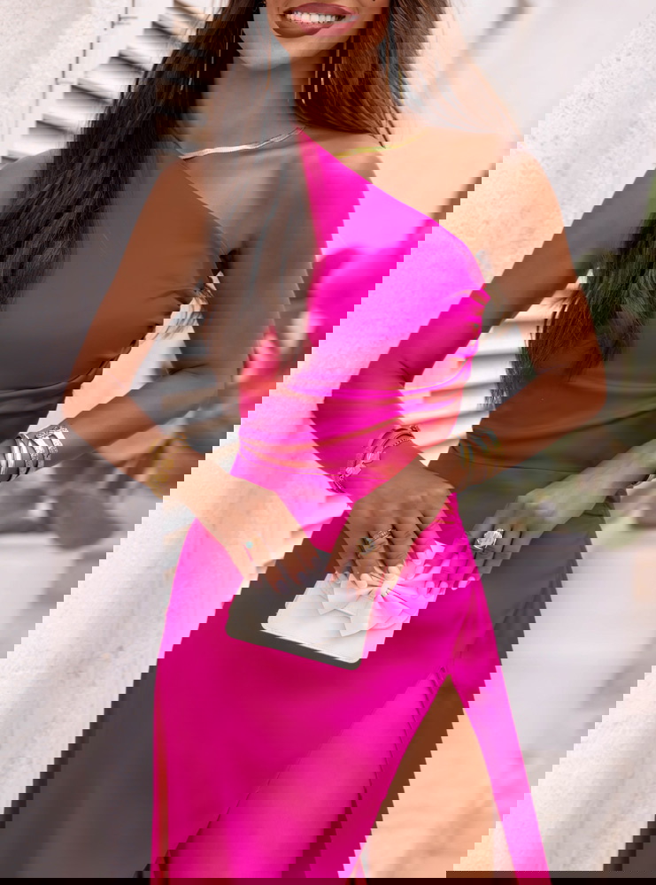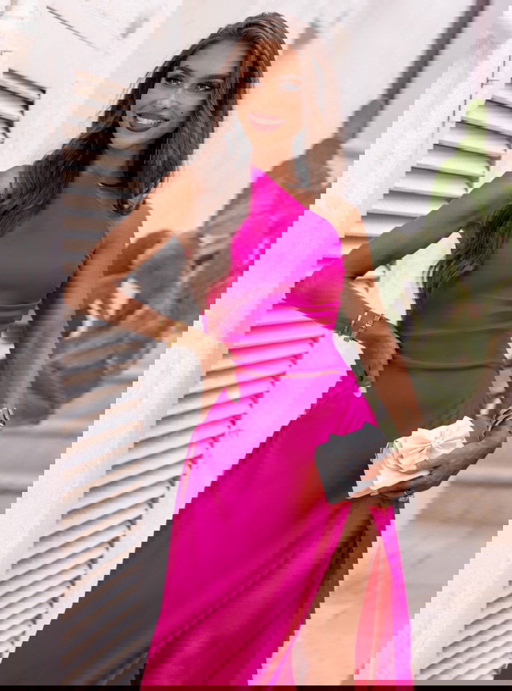 Satynowa sukienka na jedno ramię Rossella - fuksja to doskonały wybór na wyjątkowe chwile. Sprawdzi się podczas przyjęć, eleganckich kolacji, wesel czy balów.