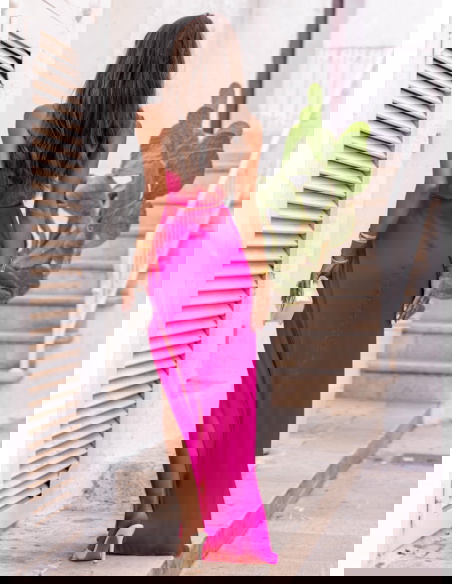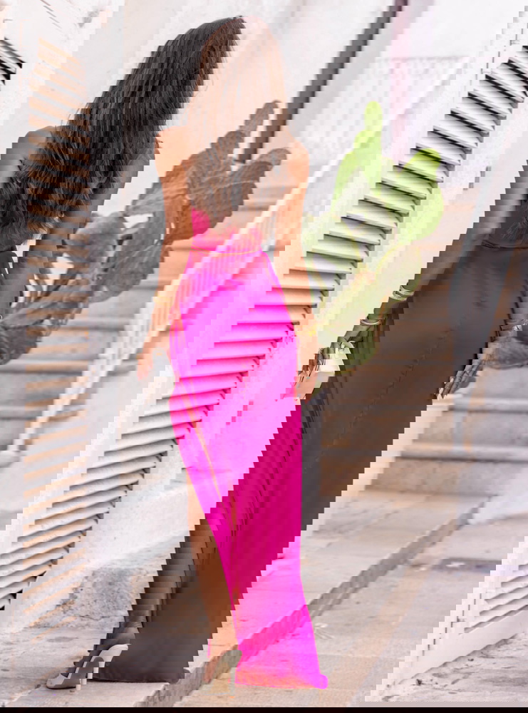 Satynowa sukienka na jedno ramię Rossella - fuksja to kwintesencja kobiecości i elegancji w najbardziej efektownym wydaniu. Jej intensywny kolor przyciąga spojrzenia i dodaje pewności siebie, sprawiając, że trudno przejść obok niej obojętnie. Asymetryczny krój z odkrytym ramieniem to detal, który nadaje całej stylizacji wyjątkowego charakteru. To propozycja dla kobiet, które lubią błyszczeć i wyróżniać się z klasą. Długa, lejąca się forma przepięknie układa się w ruchu, tworząc spektakularny efekt. Wysokie rozcięcie na nodze dodaje odważnego, zmysłowego akcentu, który idealnie równoważy elegancką linię sukienki. Delikatny połysk satyny subtelnie odbija światło, podkreślając każdy ruch. To kreacja, która doskonale łączy w sobie kobiecość, siłę i subtelny wdzięk. Z tą sukienką każda okazja stanie się wyjątkowa.