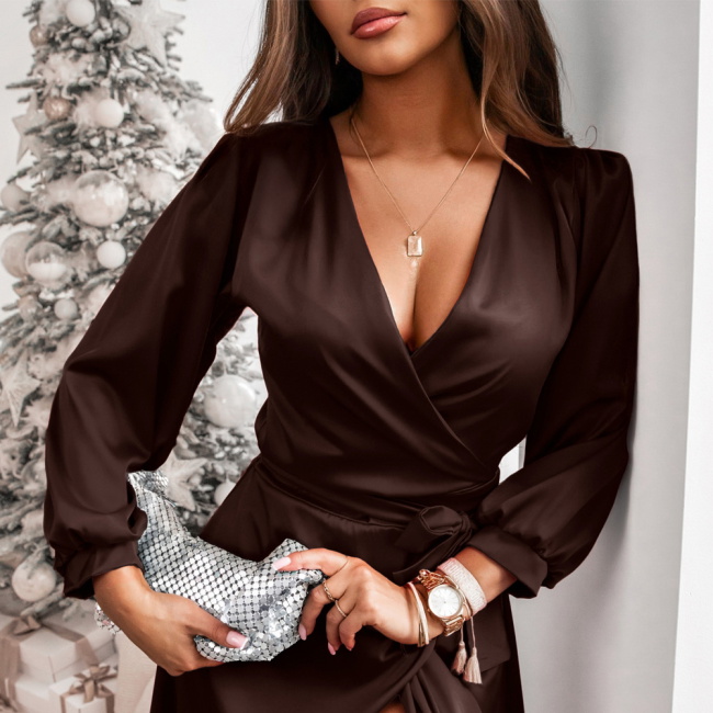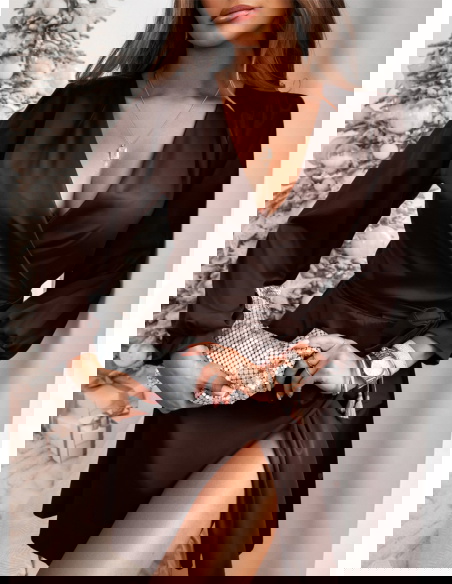 Czekoladowa satynowa sukienka przekładana z dekoltem Jannella