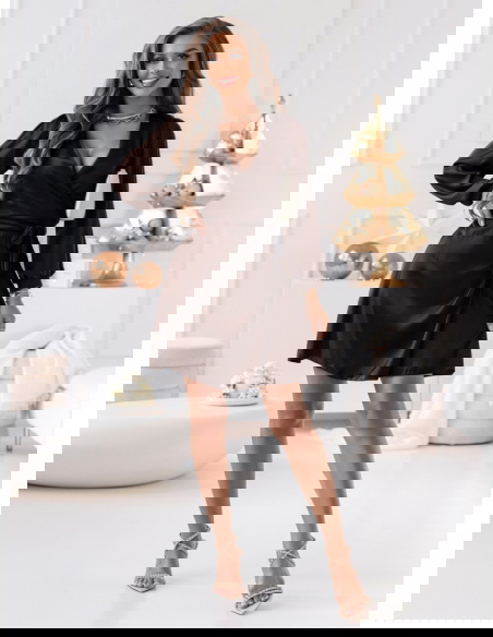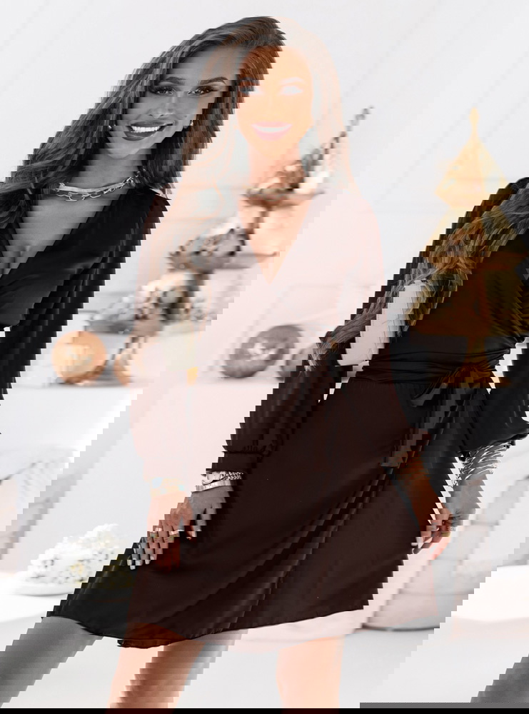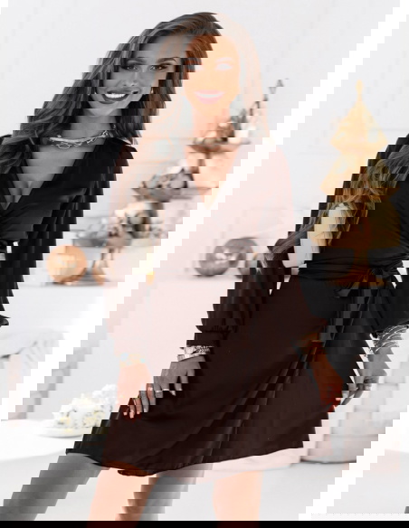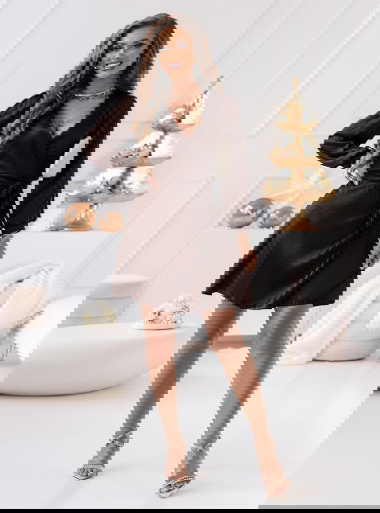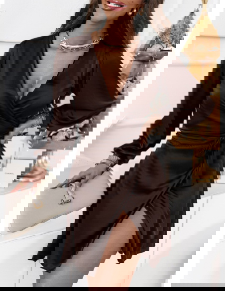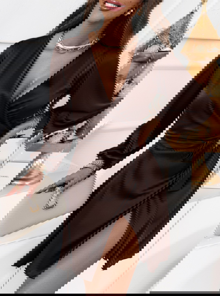 Czekoladowa satynowa sukienka przekładana z dekoltem Anonna to propozycja, która łączy ponadczasową elegancję z nutą zmysłowości. Jej delikatny połysk pięknie odbija światło, tworząc subtelny, luksusowy efekt. Kopertowy krój podkreśla kobiecą sylwetkę, a wiązanie w talii akcentuje jej najwęższy punkt, nadając figurze harmonii i lekkości. Długie rękawy dodają klasy, a głęboki dekolt w serek sprawia, że całość prezentuje się wyjątkowo kobieco. To sukienka, która sprawdzi się zawsze, gdy chcesz poczuć się wyjątkowo.
