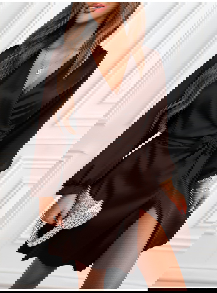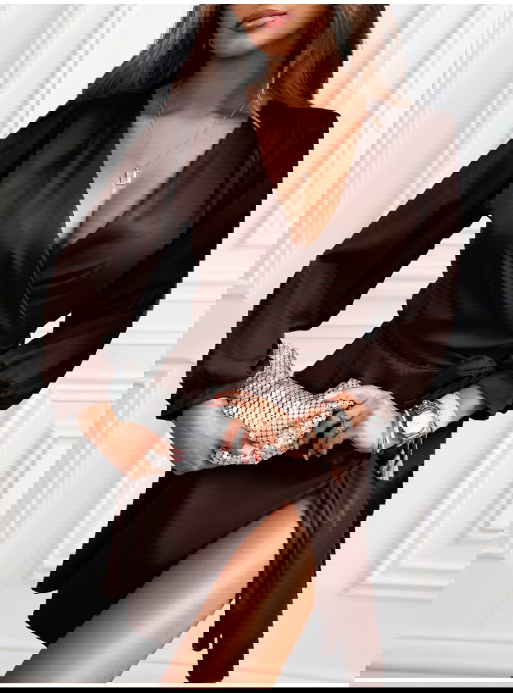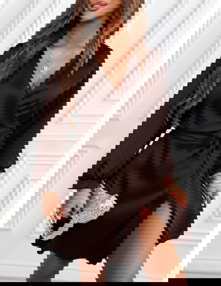 Czekoladowa satynowa sukienka przekładana z dekoltem Byrdene