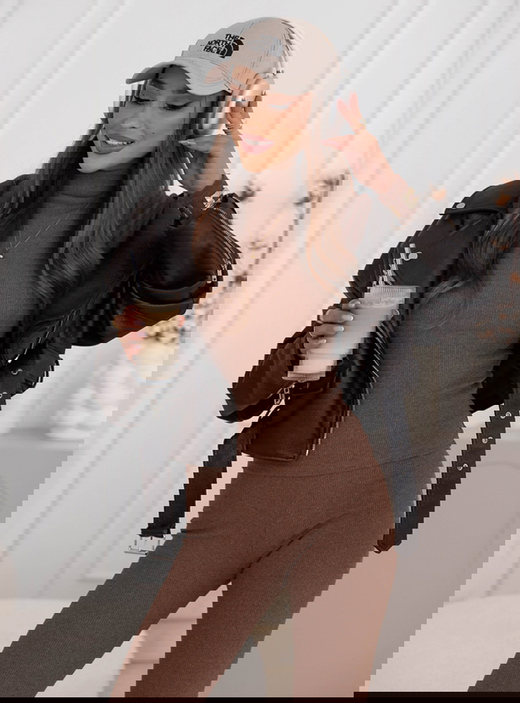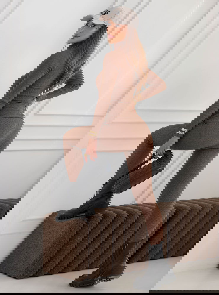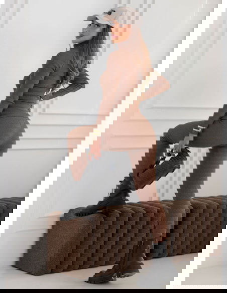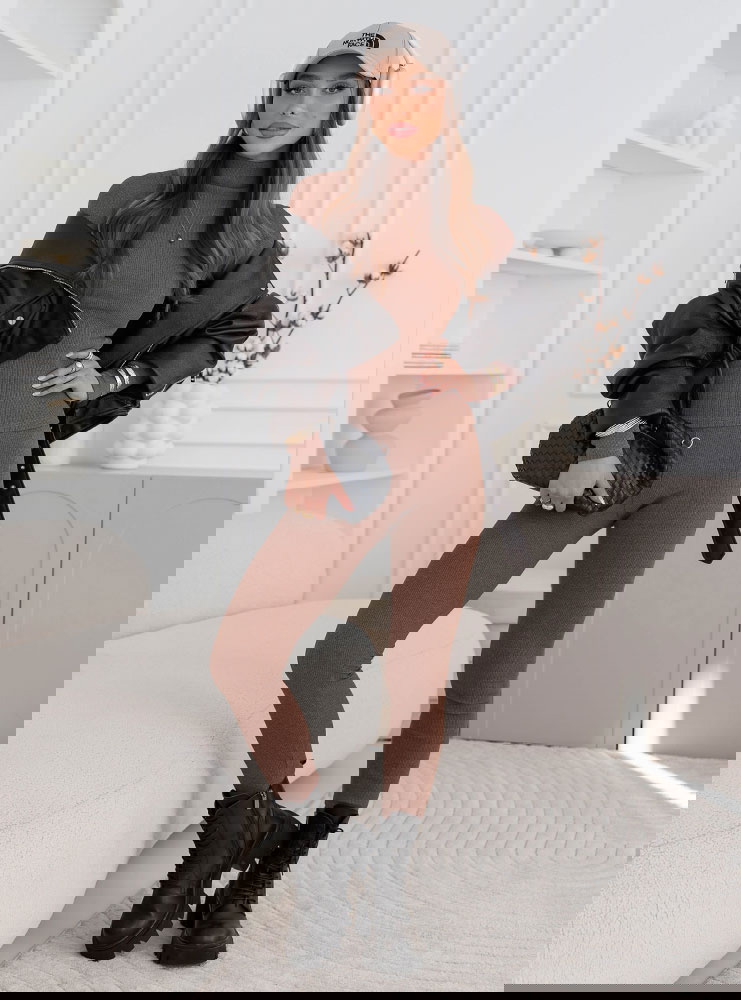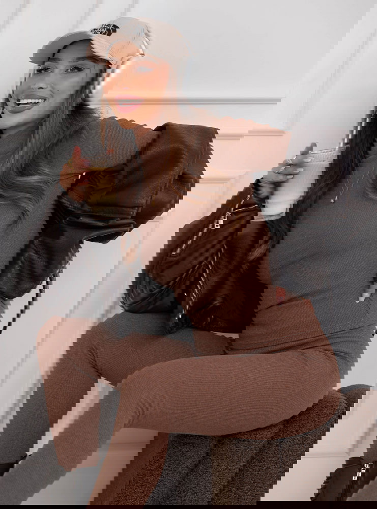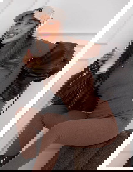 Prążkowany komplet bluzka z golfem i leginsy Milly - mocha mousse to idealne połączenie elegancji, wygody i kobiecego stylu. Jego ciepły, stonowany odcień mocha mousse sprawia, że wygląda wyjątkowo subtelnie i modnie. Dopasowany krój pięknie podkreśla sylwetkę, nie ograniczając przy tym swobody ruchów. Wysoki golf dodaje całości elegancji i sprawia, że zestaw doskonale sprawdza się również w chłodniejsze dni. Prążkowana struktura materiału optycznie wysmukla figurę i nadaje jej nowoczesnego charakteru. To komplet, który doskonale łączy casualowy luz z odrobiną wyrafinowania. Mocha mousse to kolor, który świetnie współgra z beżami, czernią czy złotymi dodatkami, tworząc wiele stylowych kombinacji. Komplet prezentuje się efektownie zarówno solo, jak i w zestawieniu z kurtką lub płaszczem. To wybór, który pozwoli Ci wyglądać modnie w każdej sytuacji. Dzięki niemu poczujesz się komfortowo, stylowo i pewnie siebie każdego dnia.