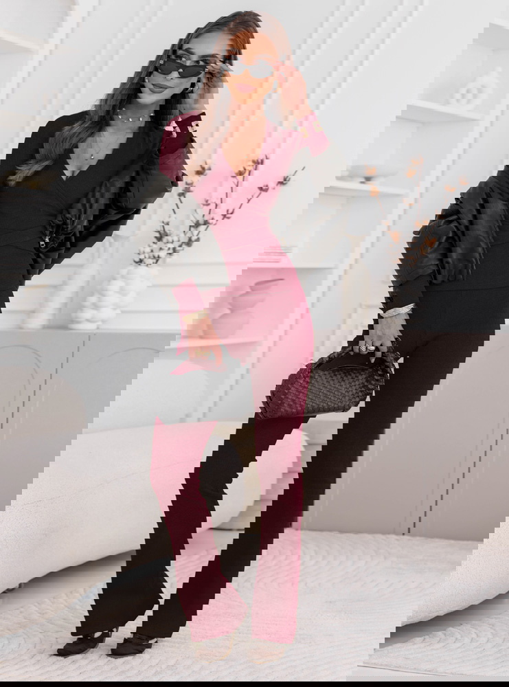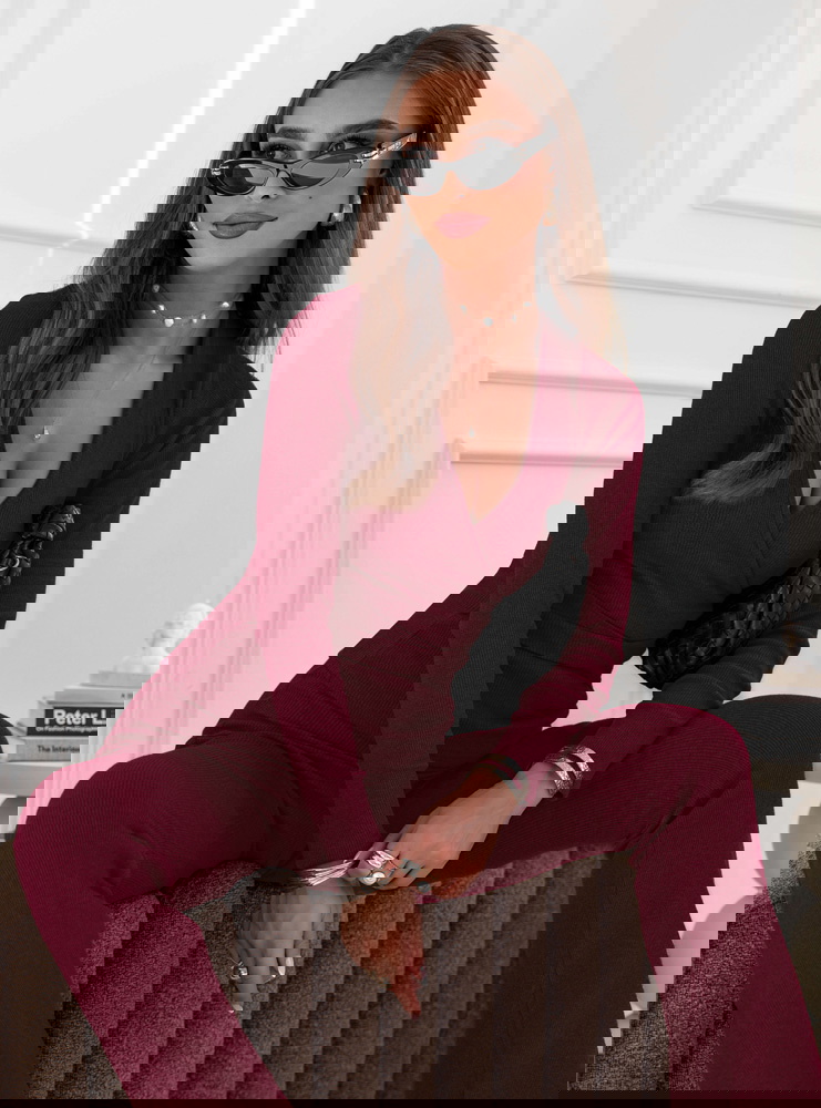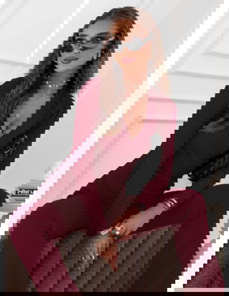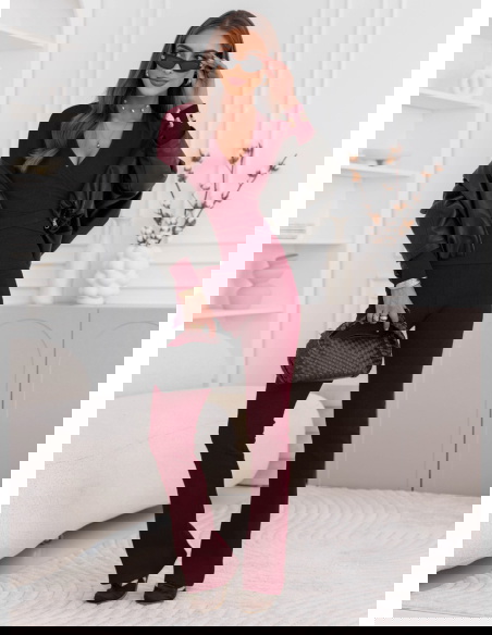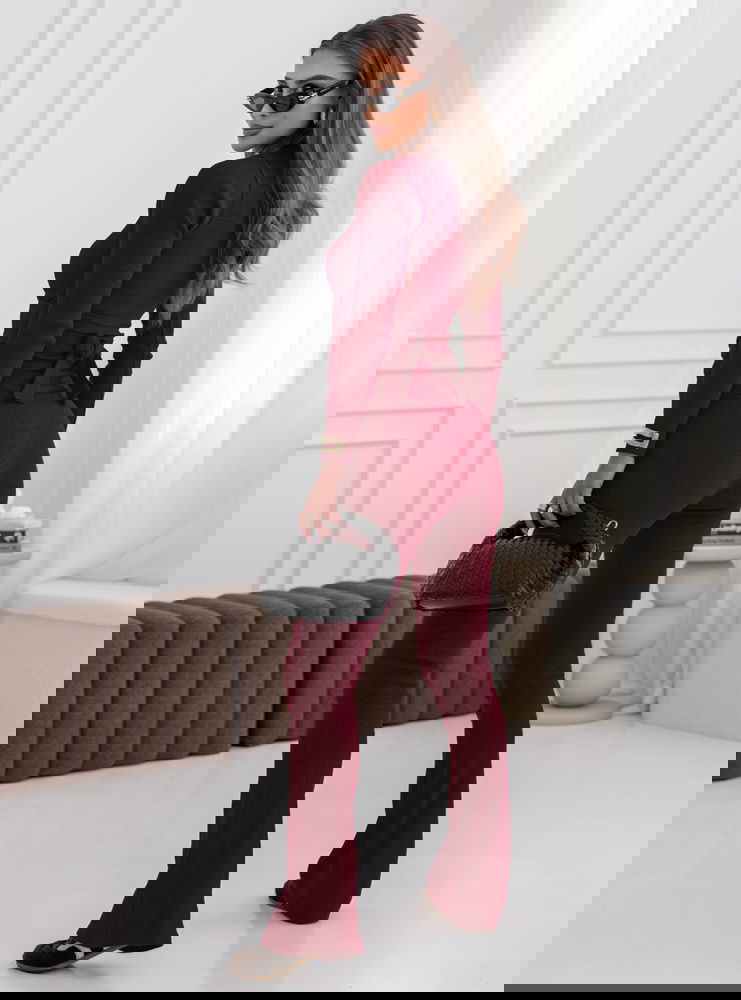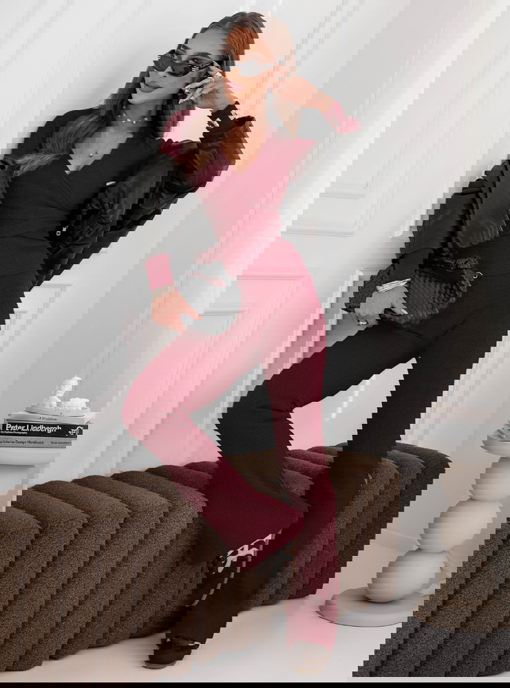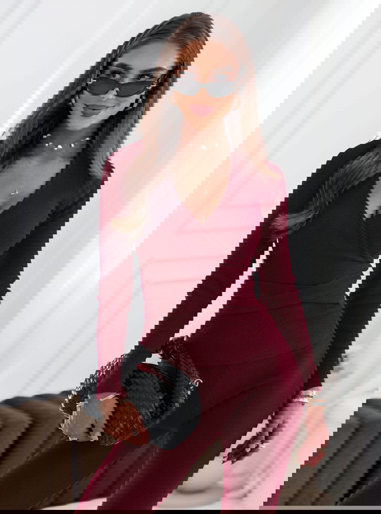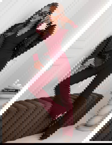 Bordowy prążkowany komplet bluzka z wiązaniem i spodnie Rosanda to kwintesencja kobiecego stylu w wygodnej formie. Jego głęboki kolor przyciąga uwagę i dodaje klasy każdej stylizacji. Dopasowany krój i prążkowana faktura sprawiają, że wygląda niezwykle modnie. Wiązanie w pasie pięknie podkreśla figurę i dodaje subtelnego uroku. To zestaw, który doskonale łączy codzienny luz z elegancją. Idealny wybór dla kobiet, które lubią wyglądać stylowo, nie rezygnując z komfortu. W tym komplecie każda chwila nabiera wyjątkowego charakteru.