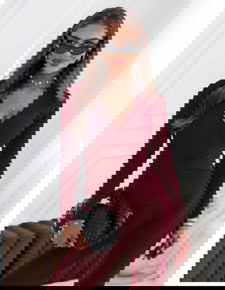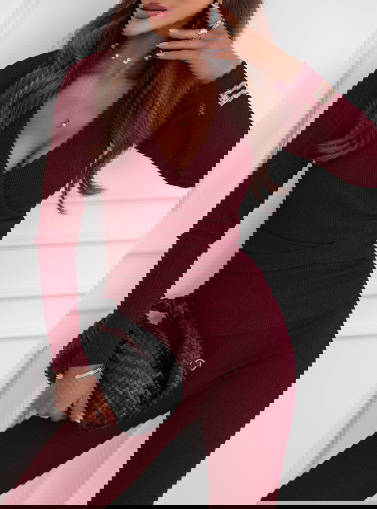 Bordowy prążkowany komplet bluzka z wiązaniem i spodnie Rosanda to propozycja, która łączy w sobie wygodę i kobiecy szyk. Głęboki odcień bordo dodaje stylizacji elegancji i wyjątkowego charakteru. Dopasowany fason bluzki pięknie podkreśla sylwetkę, a wiązanie w pasie subtelnie akcentuje talię. Prążkowana struktura materiału wprowadza nowoczesny i modny akcent. Spodnie o lekko rozszerzanej nogawce optycznie wysmuklają nogi i dodają całości lekkości. Ten komplet to doskonałe połączenie komfortu i stylu, idealne na co dzień i na bardziej wyjątkowe okazje. Dzięki elastycznemu krojowi zapewnia pełną swobodę ruchów i wygodę przez cały dzień. Bordowy kolor doskonale współgra z neutralnymi dodatkami – beżem, czernią czy brązem. To zestaw, który pozwoli Ci poczuć się pewnie i stylowo w każdej sytuacji. Z pewnością stanie się jednym z ulubionych elementów Twojej garderoby.