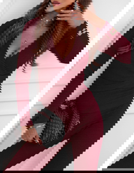 Bordowy prążkowany komplet bluzka z wiązaniem i spodnie Rosanda