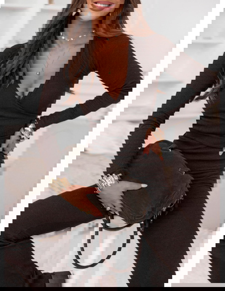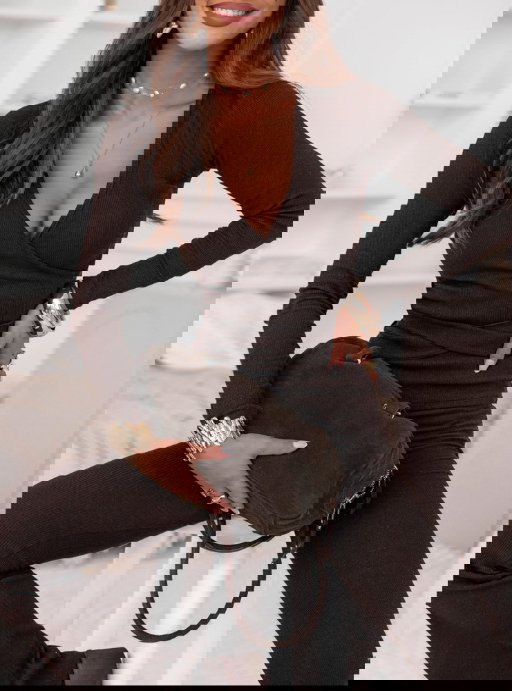 Czekoladowy prążkowany komplet bluzka z wiązaniem i spodnie Rosanda