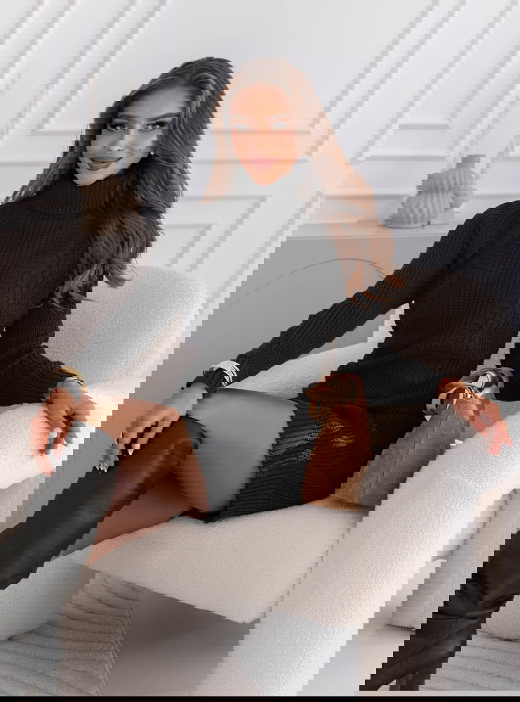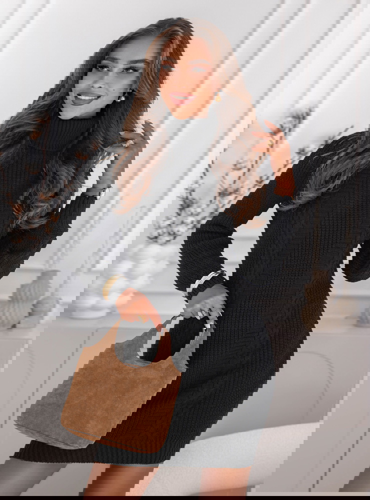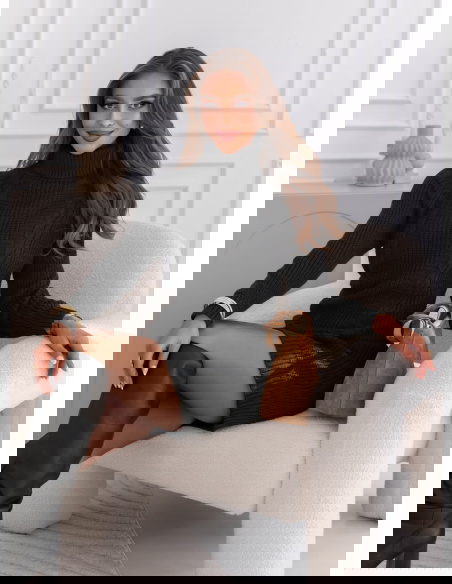 Czarna sukienka swetrowa z warkoczowymi splotami Bernadina to kwintesencja ponadczasowej elegancji i kobiecego stylu. Jej dopasowany fason pięknie podkreśla figurę, jednocześnie zapewniając pełen komfort noszenia. Wysoki golf dodaje klasy i szyku, a jednocześnie otula ciepłem w chłodniejsze dni. Warkoczowe sploty wzdłuż sylwetki nadają sukience wyjątkowego charakteru, tworząc efektowną strukturę. Miękka, elastyczna dzianina idealnie dopasowuje się do ciała, gwarantując wygodę przez cały dzień. Głęboka czerń sprawia, że sukienka prezentuje się niezwykle elegancko i pasuje na wiele okazji. To model, który z łatwością można wystylizować zarówno w wersji codziennej, jak i bardziej wieczorowej. Wystarczy dobrać długie kozaki i płaszcz, by stworzyć stylowy, nowoczesny look. Jej uniwersalność sprawia, że stanie się ulubionym elementem zimowej garderoby. To idealne połączenie klasyki, komfortu i zmysłowości.