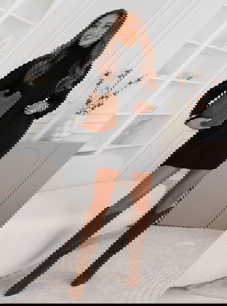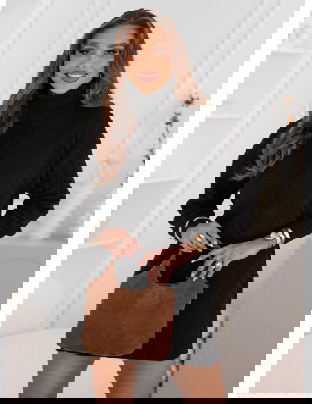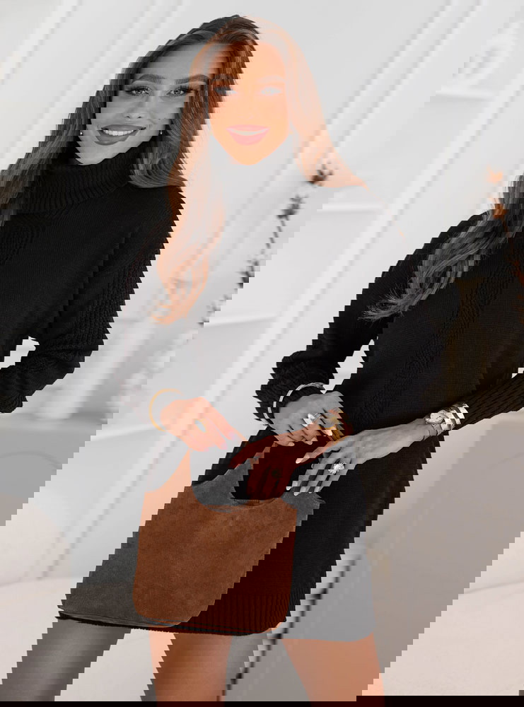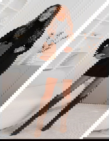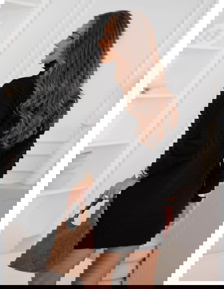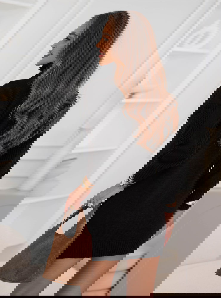 Czarna sweterkowa sukienka z golfem Eadmund to połączenie klasy, kobiecości i wygody w jednym. Wykonana z miękkiej, ciepłej dzianiny, doskonale sprawdzi się w chłodne dni, zapewniając komfort i styl. Głęboka czerń nadaje stylizacji eleganckiego i ponadczasowego charakteru. Klasyczny warkoczowy splot z przodu dodaje jej przytulnego, zimowego uroku. Wysoki golf otula szyję i stanowi stylowy detal, który podkreśla szyk całego looku. Długie rękawy zakończone ściągaczami nadają całości harmonii i wygody. Fason subtelnie dopasowuje się do sylwetki, delikatnie ją podkreślając, ale nie opina ciała. Sukienka świetnie wygląda zarówno z wysokimi kozakami, jak i botkami na obcasie. Można ją nosić na co dzień, do pracy lub na wieczorne wyjście. To klasyka, która nigdy nie wychodzi z mody i stanowi idealną bazę do wielu jesienno-zimowych stylizacji.