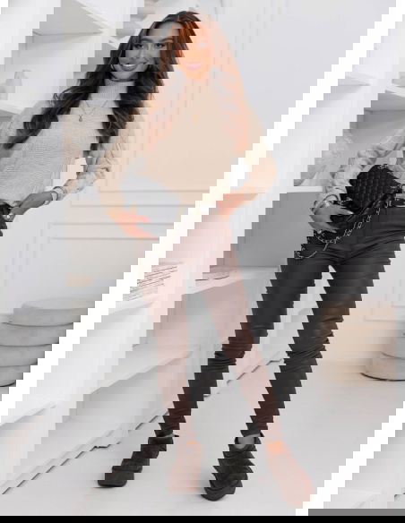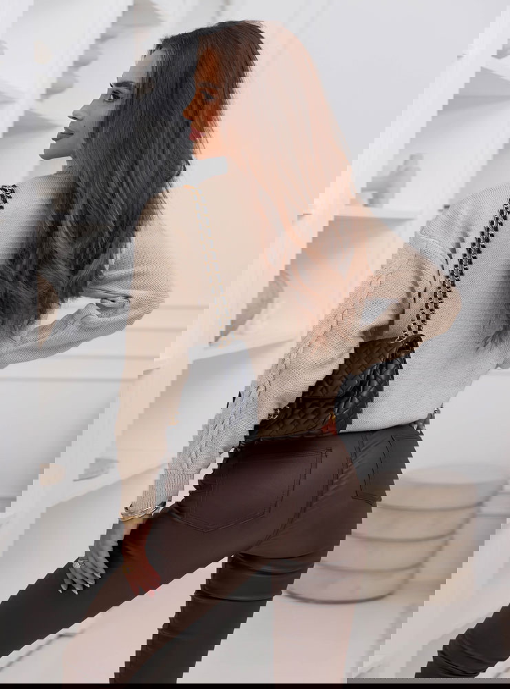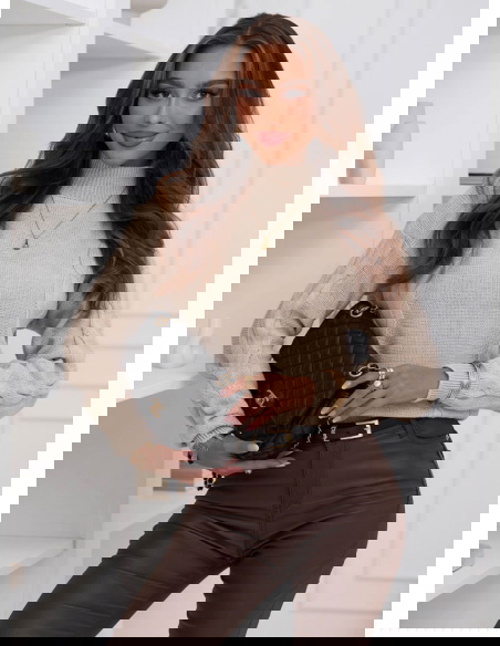 Beżowy sweter z półgolfem Chirine to klasyczna i niezwykle kobieca propozycja na chłodniejsze dni. Jego elegancki, jasny odcień beżu idealnie wpisuje się w aktualne trendy, dodając stylizacjom subtelności i klasy. Wykonany z miękkiej, przyjemnej w dotyku dzianiny zapewnia komfort noszenia przez cały dzień. Półgolf delikatnie otula szyję, tworząc efektowne, ale nieprzytłaczające wykończenie. Rękawy z delikatnym, lekko pufiastym krojem i ściągaczami nadają mu nowoczesnego charakteru. Sweter ma prosty, lekko dopasowany fason, który pięknie układa się na sylwetce. Doskonale wygląda zarówno w eleganckich, jak i casualowych zestawach. Świetnie komponuje się ze spodniami z ekoskóry, klasycznymi jeansami czy spódnicą midi. Beżowy kolor sprawia, że jest to uniwersalny element garderoby, który można zestawiać niemal z każdą barwą. To idealny wybór dla kobiet, które cenią połączenie stylu, wygody i ponadczasowej elegancji.