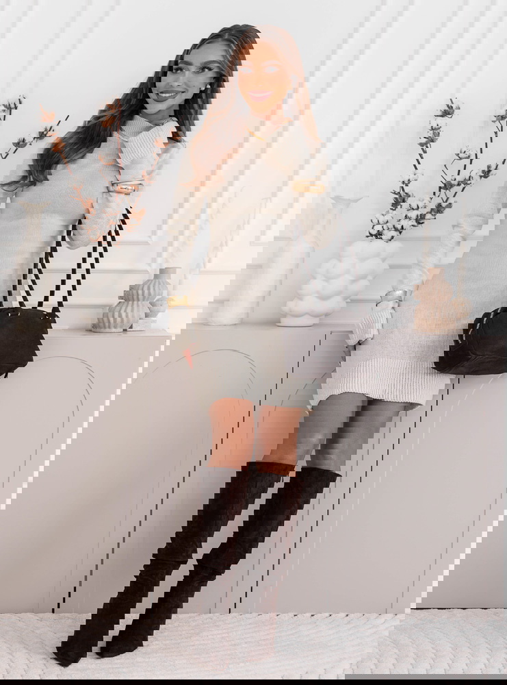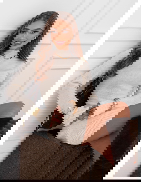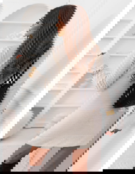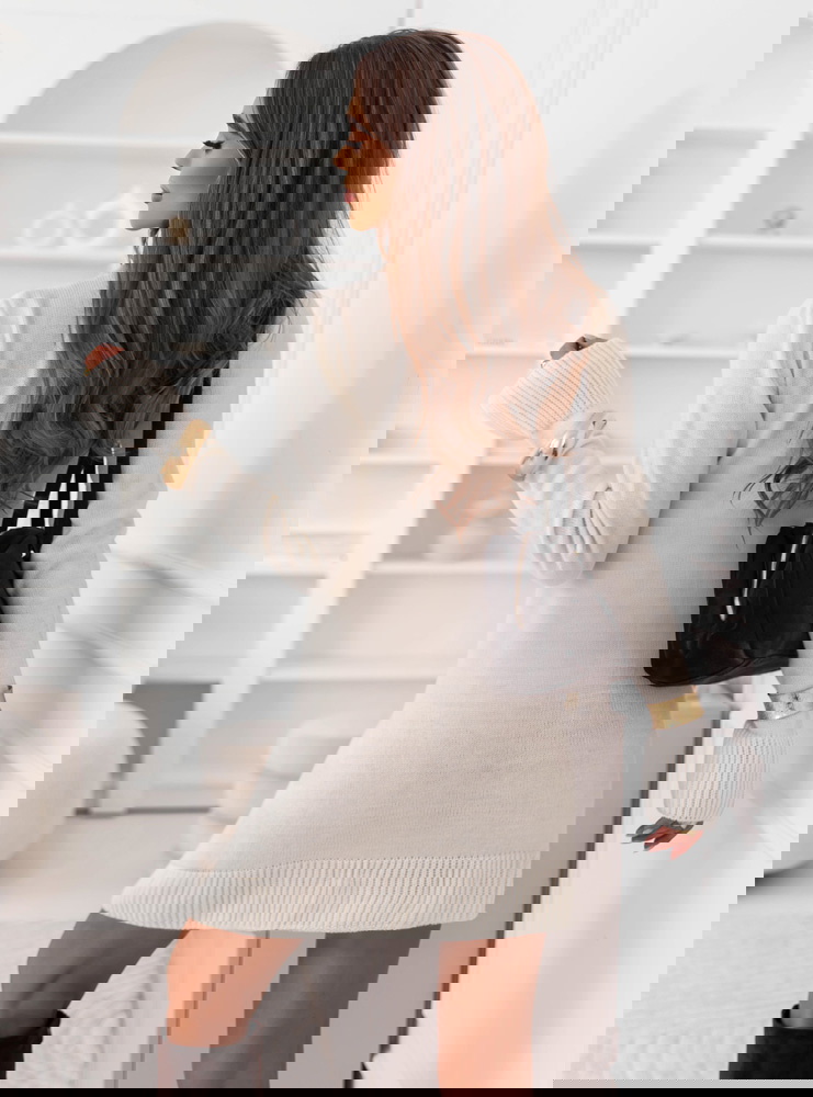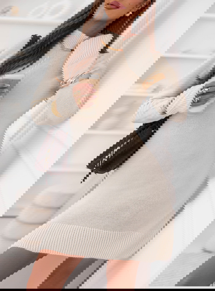 Swetrowa sukienka z półgolfem Louvenia - ecru to połączenie klasyki, kobiecości i wygody. Jej subtelny, kremowy odcień doskonale podkreśla delikatność i elegancję stylizacji. Wykonana z miękkiej, elastycznej dzianiny idealnie dopasowuje się do sylwetki, podkreślając kobiece kształty. Półgolf subtelnie otula szyję, dodając całości szyku i ciepła. Długie rękawy zakończone szerokimi ściągaczami nadają jej modnego charakteru i zapewniają wygodę noszenia. Sukienka ma minimalistyczny krój, dzięki czemu jest niezwykle uniwersalna i ponadczasowa. Świetnie sprawdzi się zarówno w codziennych, jak i bardziej eleganckich stylizacjach. Możesz ją zestawić z kozakami, botkami lub klasycznymi szpilkami – zawsze wygląda stylowo. Kolor ecru wprowadza świeżość i lekkość, idealnie pasując do zimowych dni. To model, który łączy prostotę z elegancją, zapewniając komfort przez cały dzień.