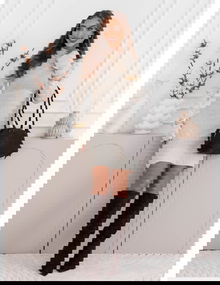 Swetrowa sukienka z półgolfem Louvenia - ecru to kwintesencja elegancji w zimowym wydaniu. Jej dopasowany krój pięknie podkreśla sylwetkę, a miękka dzianina zapewnia ciepło i wygodę. Półgolf dodaje klasy i delikatnie wydłuża szyję. Neutralny odcień ecru pasuje do każdego typu urody i stanowi świetną bazę do wielu stylizacji. To model, który sprawdzi się zarówno na co dzień, jak i na wyjątkowe okazje. Prosty, ale niezwykle kobiecy fason czyni ją niezastąpionym elementem garderoby. Stylowa, ciepła i uniwersalna – idealna propozycja na chłodne dni.