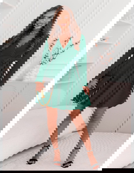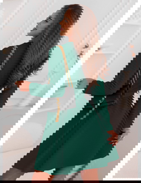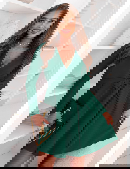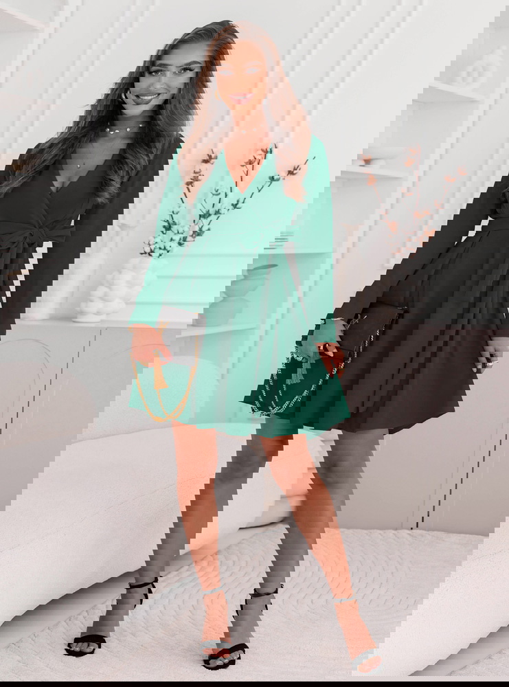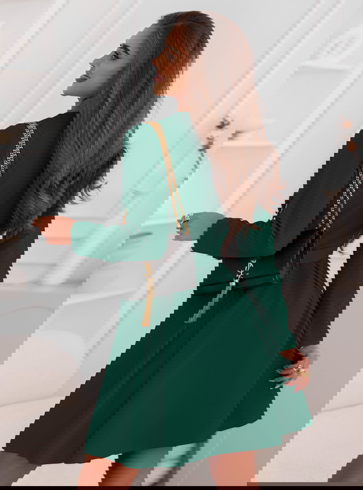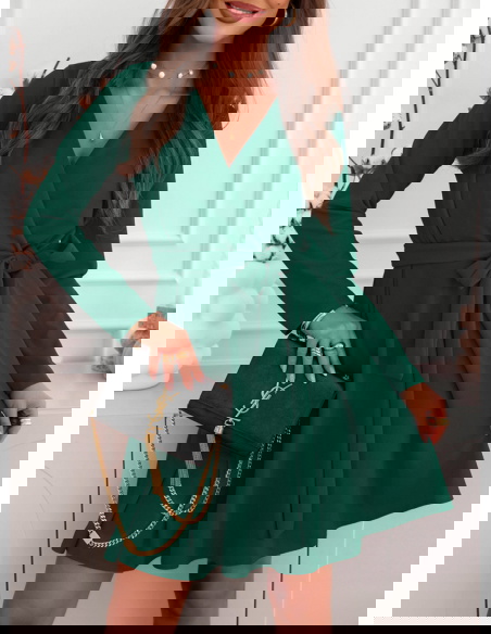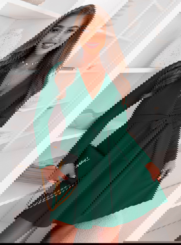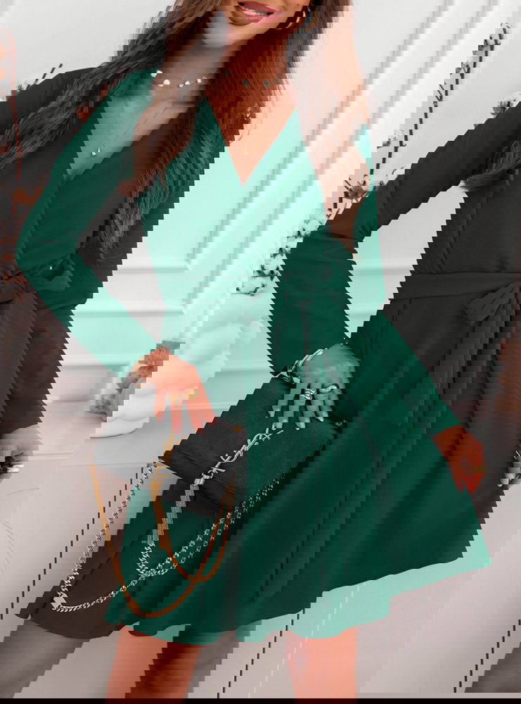 Sukienka z przekładanym dekoltem z paskiem Kaitlan - butelkowa zieleń to połączenie elegancji, klasy i ponadczasowego stylu. Jej głęboki, szlachetny odcień zieleni dodaje stylizacji wyjątkowego charakteru i idealnie komponuje się z jesienno-zimową paletą barw. Kopertowy dekolt pięknie eksponuje szyję i subtelnie podkreśla dekolt. Pasek w talii pozwala dopasować sukienkę do sylwetki, tworząc idealne proporcje i zaznaczając kobiece kształty. Rozkloszowany dół dodaje lekkości i wdzięku, nadając stylizacji romantycznego wyrazu. Długie rękawy sprawiają, że to model idealny na chłodniejsze dni, a miękki materiał gwarantuje pełen komfort noszenia. Butelkowa zieleń to kolor elegancji i wyrafinowania, który pasuje zarówno brunetkom, jak i blondynkom. Sukienka zachwyca prostym, ale niezwykle efektownym krojem, który doskonale sprawdzi się na różne okazje. To propozycja, która łączy w sobie kobiecość i subtelny urok. Stylowa, wygodna i uniwersalna – stanie się jednym z ulubionych elementów Twojej garderoby.