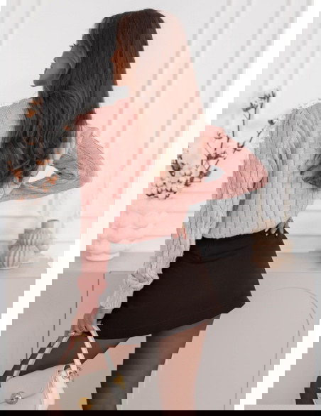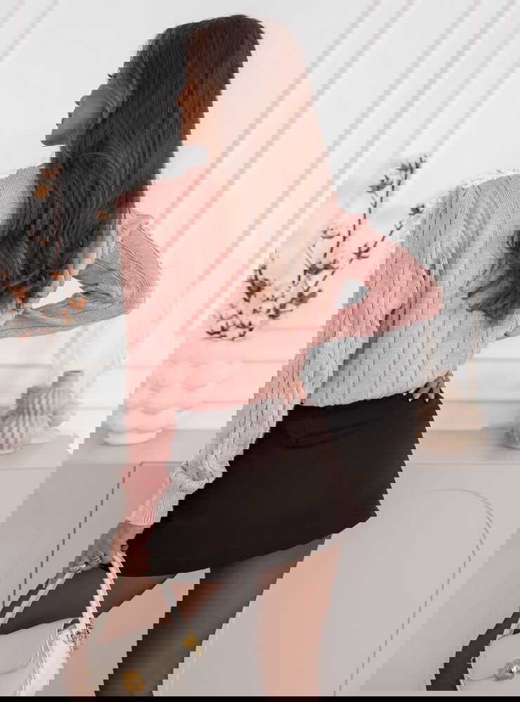 Pudrowy sweter z ozdobną koronką...