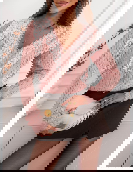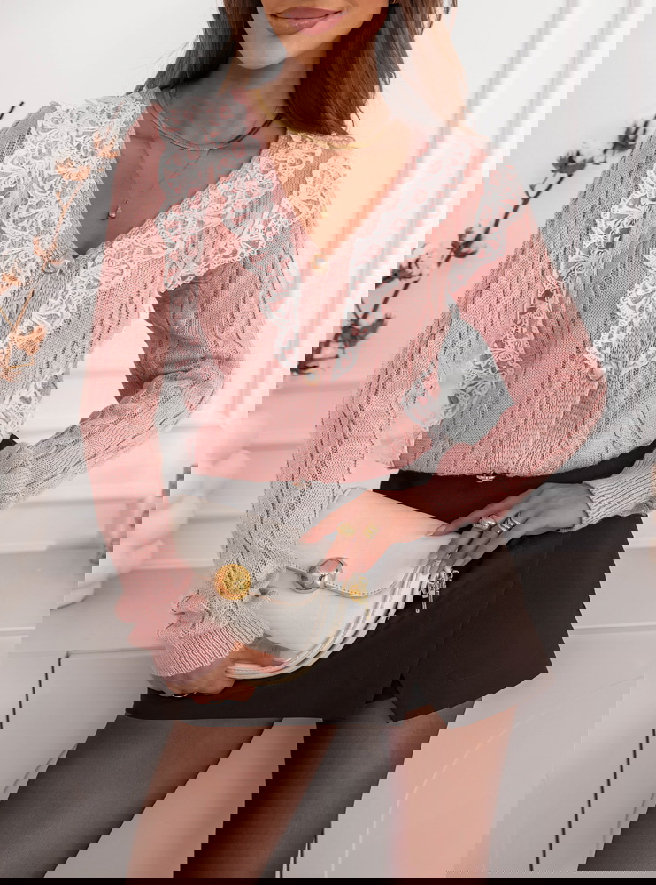 Pudrowy sweter z ozdobną koronką zapinany na guziki Chantilly