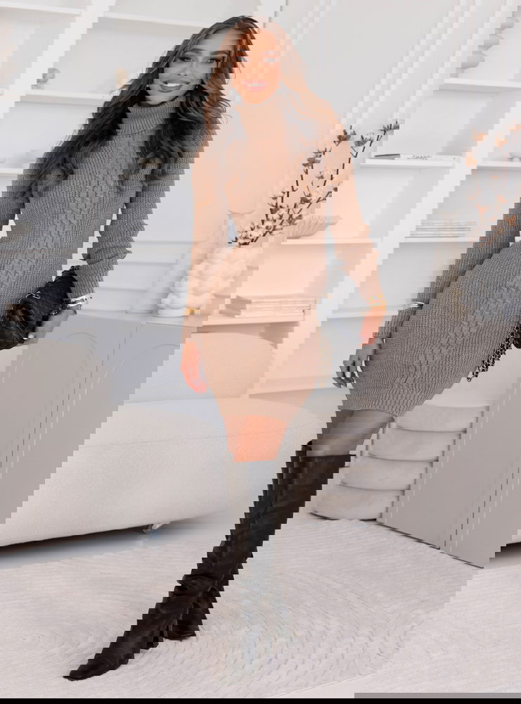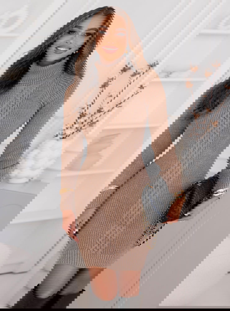 Sweterkowa sukienka z golfem Theralu - mocha mousse to kwintesencja jesiennej elegancji i kobiecego wdzięku. Jej uniwersalny odcień sprawia, że z łatwością połączysz ją z ulubionymi dodatkami.
