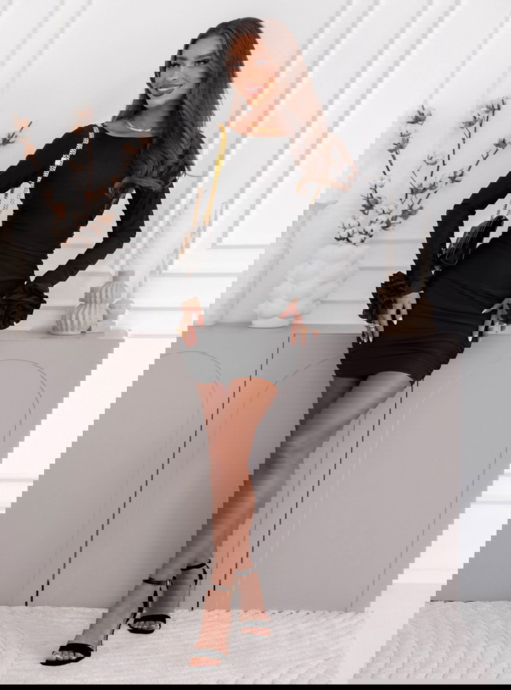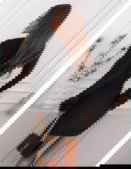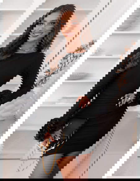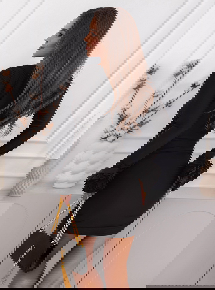 Czarna dopasowana sukienka z ozdobnymi różami na rękawach Monalaine to połączenie elegancji, kobiecości i nowoczesnego stylu. Jej dopasowany krój pięknie podkreśla figurę, a wyjątkowe detale dodają jej charakteru.