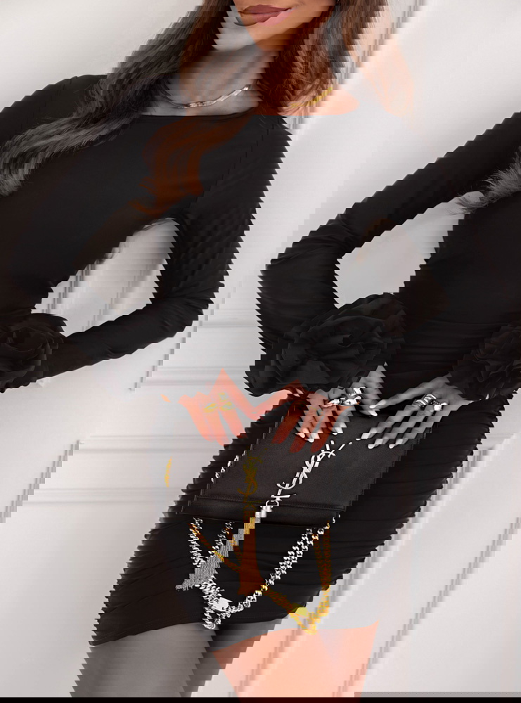 Czarna dopasowana sukienka z ozdobnymi różami na rękawach Monalaine