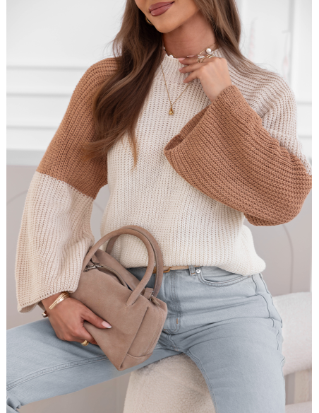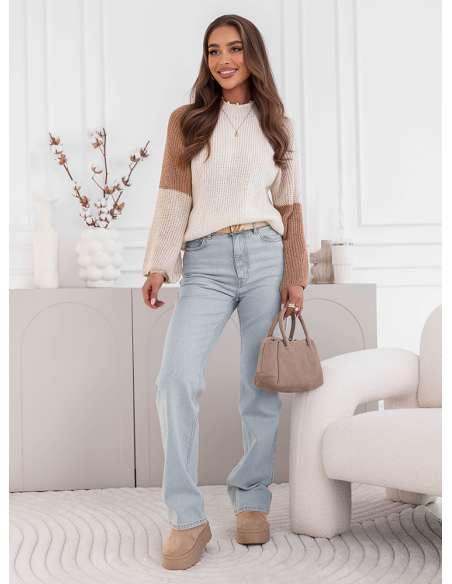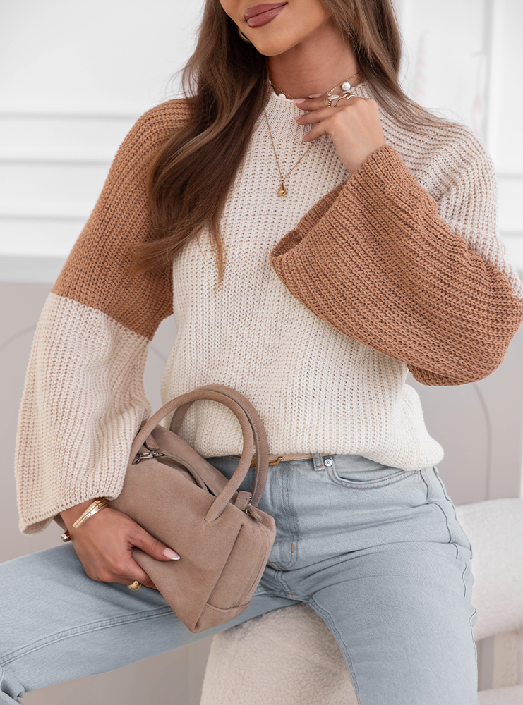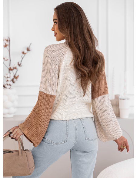Sweter z szerokimi rękawami Stellar  - ecru to idealne połączenie stylu, komfortu i jesiennego uroku. Jego delikatna kolorystyka wprowadza spokój i elegancję do każdej stylizacji, a luźny krój sprawia, że wygląda niezwykle lekko i kobieco. To model, który łączy w sobie swobodę z modowym wyrafinowaniem. Szerokie rękawy dodają całości oryginalnego charakteru, tworząc efekt nowoczesnej, ale przytulnej elegancji. Sweter pięknie układa się na sylwetce, subtelnie podkreślając jej atuty. Zestawienie beżowych tonów z kremową bazą tworzy harmonijną kompozycję, idealną na chłodniejsze dni. To doskonała propozycja dla kobiet, które lubią połączenie luzu i stylu w jednym. Sweter w odcieniu ecru to must-have na sezon jesień–zima — otula ciepłem, a przy tym wygląda niezwykle modnie. To model, który z łatwością dopasujesz do swojego codziennego rytmu i stylu.